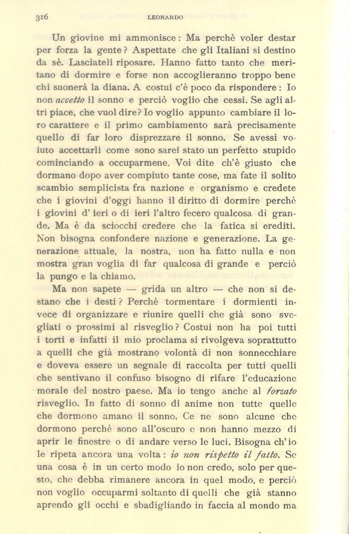 Un giovine mi ammonisce : Ma perchè voler destar per forza la gente ? Aspettate che gli Italiani si destino da sè. Lasciateli riposare. Hanno fatto tanto che meritano di dormire e forse non accoglieranno troppo bene chi suonerà la diana. A costui c'è poco da rispondere : Io non accetto il sonno e perciò voglio che cessi. Se agli altri piace, che vuol dire? Io voglio appunto cambiare il loro carattere e il primo cambiamento sarà precisamente quello di far loro disprezzare il sonno. Se avessi voluto accettarli come sono sarei stato un perfetto stupido cominciando a occuparmene. Voi dite ch'è giusto che dormano dopo aver compiuto tante cose, ma fate il solito scambio semplicista fra nazione e organismo e credete che i giovini d'oggi hanno il diritto di dormire perchè i giovini d'ieri o di ieri l'altro fecero qualcosa di grande. Ma è da sciocchi credere che la fatica si erediti. Non bisogna confondere nazione e generazione. La generazione attuale, la nostra, non ha fatto nulla e non mostra gran voglia di far qualcosa di grande e perciò la pungo e la chiamo.
