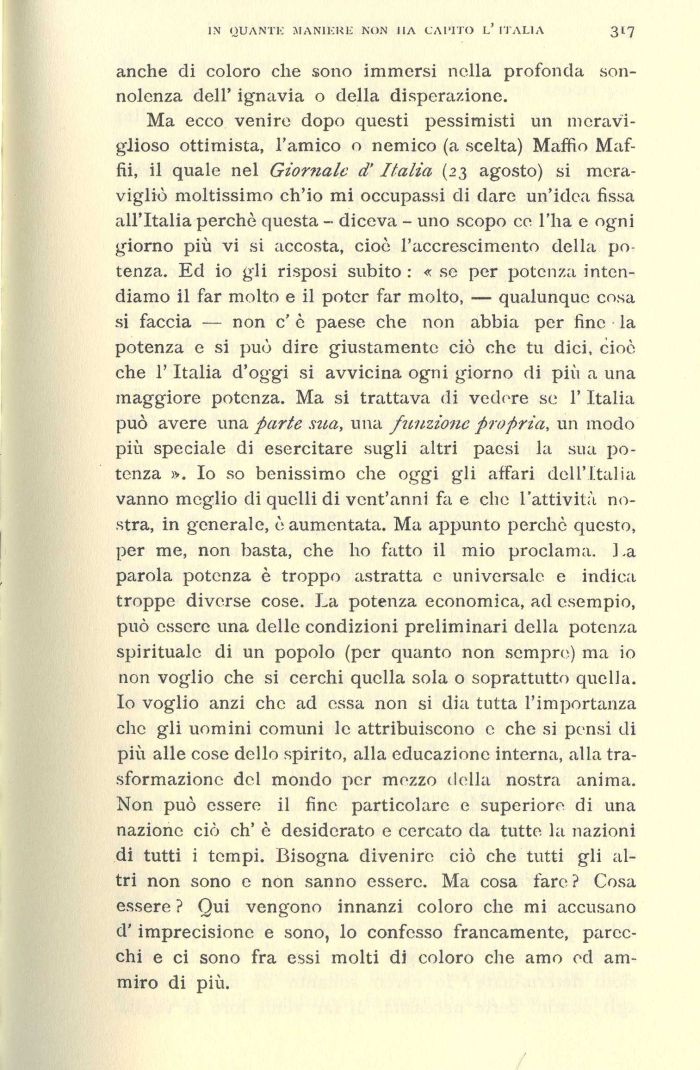 Ma ecco venire dopo questi pessimisti un meraviglioso ottimista, l'amico o nemico (a scelta) Maio Maf-fii, il quale nel Giornale d'Italia (23 agosto) si meravigliò moltissimo ch'io mi occupassi di dare un'idea fissa all'Italia perchè questa - diceva - uno scopo ce l'ha e ogni giorno più vi si accosta, cioè l'accrescimento della potenza. Ed io gli risposi subito : « se per potenza intendiamo il far molto e il poter far molto, — qualunque cosa si faccia — non c' è paese che non abbia per fine la potenza e si può dire giustamente ciò che tu dici, cioè che l'Italia d'oggi si avvicina ogni giorno di più a una maggiore potenza. Ma si trattava di vedere se l'Italia può avere una parte sua, una funzione propria, un modo più speciale di esercitare sugli altri paesi la sua potenza ». Io so benissimo che oggi gii affari dell'Italia vanno meglio di quelli di vent'anni fa e che l'attività nostra, in generale, è aumentata. Ma appunto perchè questo, per me, non basta, che ho fatto il mio proclama. La parola potenza è troppo astratta e universale e indica troppe diverse cose. La potenza economica, ad esempio, può essere una delle condizioni preliminari della potenza spirituale di un popolo (per quanto non sempre) ma io non voglio che si cerchi quella sola o soprattutto quella. Io voglio anzi che ad essa non si dia tutta l'importanza che gli uomini comuni le attribuiscono e che si pensi di più alle cose dello spirito, alla educazione interna, alla trasformazione del mondo per mozzo della nostra anima. Non può essere il fine particolare e superiore di una nazione ciò eh' è desiderato e cercato da tutte la nazioni di tutti i tempi. Bisogna divenire ciò che tutti gli altri non sono e non sanno essere. Ma cosa fare ? Cosa essere ? Qui vengono innanzi coloro che mi accusano d'imprecisione e sono, lo confesso francamente, parecchi e ci sono fra essi molti di coloro che amo ed ammiro di più.