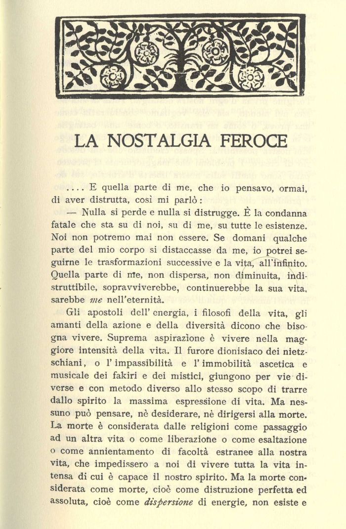 Gli apostoli dell' energia, i filosofi della vita, gli amanti della azione e della diversità dicono che bisogna vivere. Suprema aspirazione è vivere nella maggiore intensità della vita. Il furore dionisiaco dei nietzschiani, o l'impassibilità e l'immobilità ascetica e musicale dei fakiri e dei mistici, giungono per vie diverse e con metodo diverso allo stesso scopo di trarre dallo spirito la massima espressione di vita. Ma nessuno può pensare, nè desiderare, nè dirigersi alla morte. La morte è considerata dalle religioni come passaggio ad un altra vita o come liberazione o come esaltazione o come annientamento di facoltà estranee alla nostra vita, che impedissero a noi di vivere tutta la vita intensa di cui è capace il nostro spirito. Ma la morte considerata come morte, cioè come distruzione perfetta ed assoluta, cioè come dispersione di energie, non esiste e