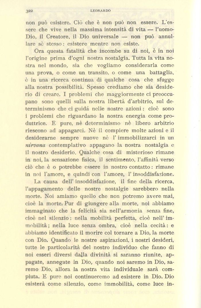 La causa dell' insoddisfazione, il fine della ricerca, l'appagamento delle nostre nostalgie sarebbero nella morte. Noi amiamo quello che non potremo avere mai, cioè la morte. Pur di giungere alla morte, noi abbiamo immaginato che la felicità sia nell'armonia senza fine, cioè nel silenzio : nella mobilità perfetta, cioè nell' immobilità ; nella luce senza ombra, cioè nella cecità : e abbiamo identificato il morire col tornare a Dio, la morte con Dio. Quando le nostre aspirazioni, i nostri desideri, tutte le particolarità del nostro individuo che fanno di noi esseri diversi dalla divinità si saranno riunite, appagate, annegate in Dio, quando noi saremo in Dio, saremo Dio, allora la nostra vita individuale sarà compiuta. E pure noi continueremo ad esistere in Dio. Dio esisterà come silenzio, come immobilità, come luce in-