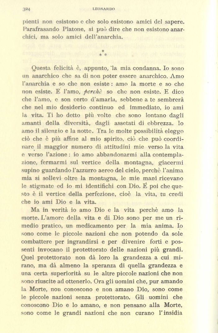 Questa felicità è, appunto, 'la mia condanna. Io sono un anarchico che sa di non poter essere anarchico. Amo l'anarchia e so che non esiste : amo la morte e so che non esiste. E l'amo, perche so che non esiste. E dico che l'amo, e son certo d'amarla, sebbene a te sembrerà che nel mio desiderio continuo ed immediato, io ami la vita. Ti ho detto più volte che sono lontano dagli amanti della diversità, dagli assetati di ebbrezza. Io amo il silenzio e la notte. Tra le molte possibilità eleggo ciò che è più affine al mio spirito, ciò che può coordinare il maggior numero di attitudini mie verso la vita e verso l'azione : io amo abbandonarmi alla contemplazione, fermarmi sul vertice della montagna, giacermi supino guardando l'azzurro aereo del cielo, perchè l'anima mia si sollevi oltre la montagna, le mie mani ricevano le stigmate ed io mi identifichi con Dio. É poi che questo è il vertice della perfezione, cioè la vita, tu credi che io ami Dio e la vita.