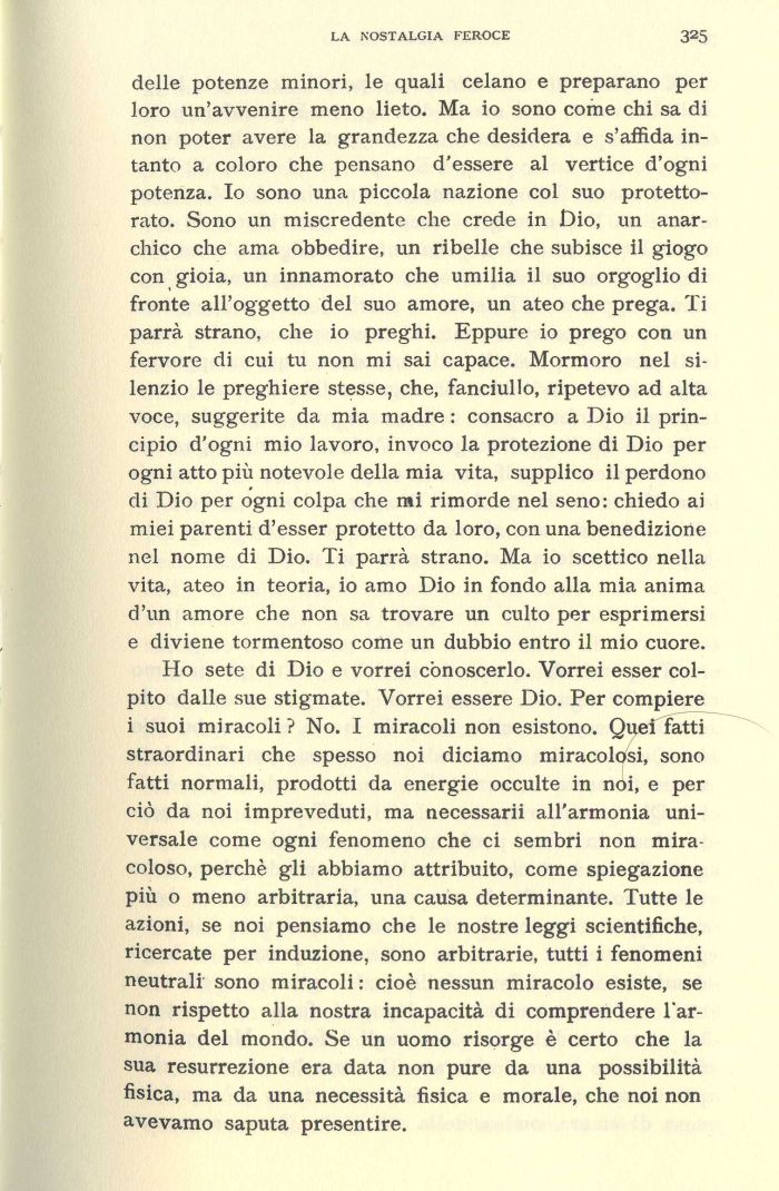 Ho sete di Dio e vorrei conoscerlo. Vorrei esser colpito dalle sue stigmate. Vorrei essere Dio. Per compiere i suoi miracoli ? No. I miracoli non esistono. Quei fatti straordinari che spesso noi diciamo miracolosi, sono fatti normali, prodotti da energie occulte in noi, e per ciò da noi impreveduti, ma necessarii all'armonia universale come ogni fenomeno che ci sembri non miracoloso, perchè gli abbiamo attribuito, come spiegazione più o meno arbitraria, una causa determinante. Tutte le azioni, se noi pensiamo che le nostre leggi scientifiche, ricercate per induzione, sono arbitrarie, tutti i fenomeni neutrali sono miracoli: cioè nessun miracolo esiste, se non rispetto alla nostra incapacità di comprendere l'armonia del mondo. Se un uomo risorge è certo che la sua resurrezione era data non pure da una possibilità fisica, ma da una necessità fisica e morale, che noi non avevamo saputa presentire.