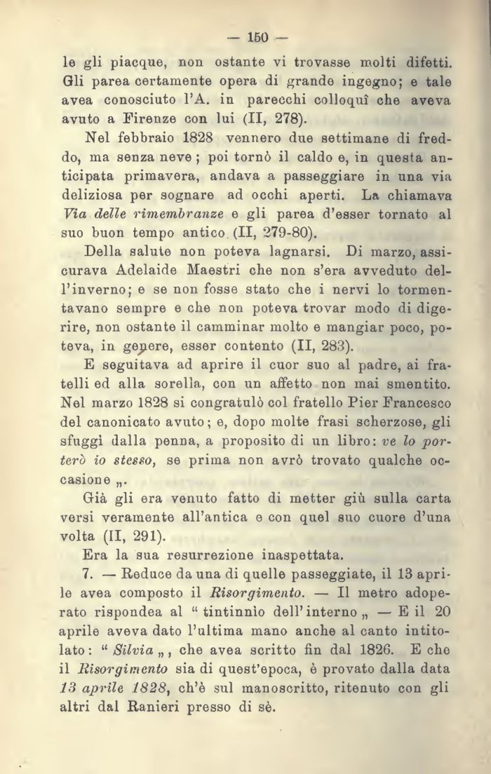 7. — Reduce da una di quelle passeggiate, il 13 aprile avea composto il Risorgimento. — Il metro adoperato rispondea al tintinnio dell' interno „ — E il 20 aprile aveva dato l'ultima mano anche al canto intitolato : Silvia „ , che avea scritto fin dal 1826. E che il Risorgimento sia di quest'epoca, è provato dalla data 13 aprile 1828, ch'è sul manoscritto, ritenuto con gli altri dal Ranieri presso di sè.