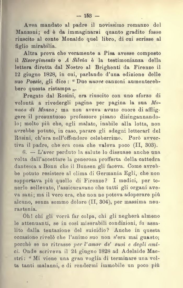 Pregato dal Rosini, era riuscito con uno sforzo di volontà a rivedergli pagina per pagina la sua Monaca di Monza; ma non aveva avuto cuore di affliggere il presuntuoso professore pisano disingannandolo; molto più che, egli malato, inabile alla lotta, non avrebbe potuto, in caso, parare gli sdegni letterari del Ró3Ìni, ch'era nell'offendere celeberrimo. Però avvertiva il padre, che era cosa che valeva poco (II, 303).