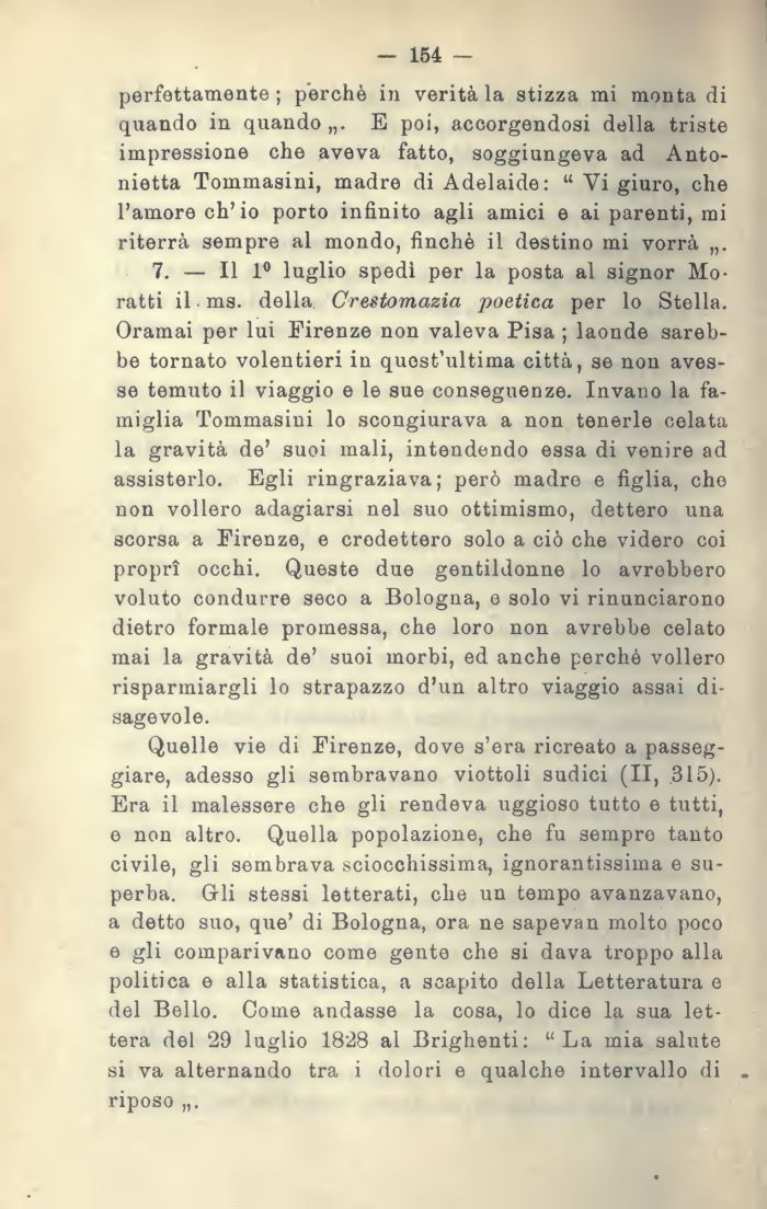 7. — Il 1° luglio spedi per la posta al signor Moratti il • ms. della Crestomazia poetica per lo Stella. Oramai per lui Firenze non valeva Pisa ; laonde sarebbe tornato volentieri in quest'ultima città, se non avesse temuto il viaggio e le sue conseguenze. Invano la famiglia Tommasini lo scongiurava a non tenerle celata la gravità de' suoi mali, intendendo essa di venire ad assisterlo. Egli ringraziava; però madre e figlia, che non vollero adagiarsi nel suo ottimismo, dettero una scorsa a Firenze, e credettero solo a ciò che videro coi propri occhi. Queste due gentildonne lo avrebbero voluto condurre seco a Bologna, e solo vi rinunciarono dietro formale promessa, che loro non avrebbe celato mai la gravità de' suoi morbi, ed anche perchè vollero risparmiargli lo strapazzo d'un altro viaggio assai disagevole.