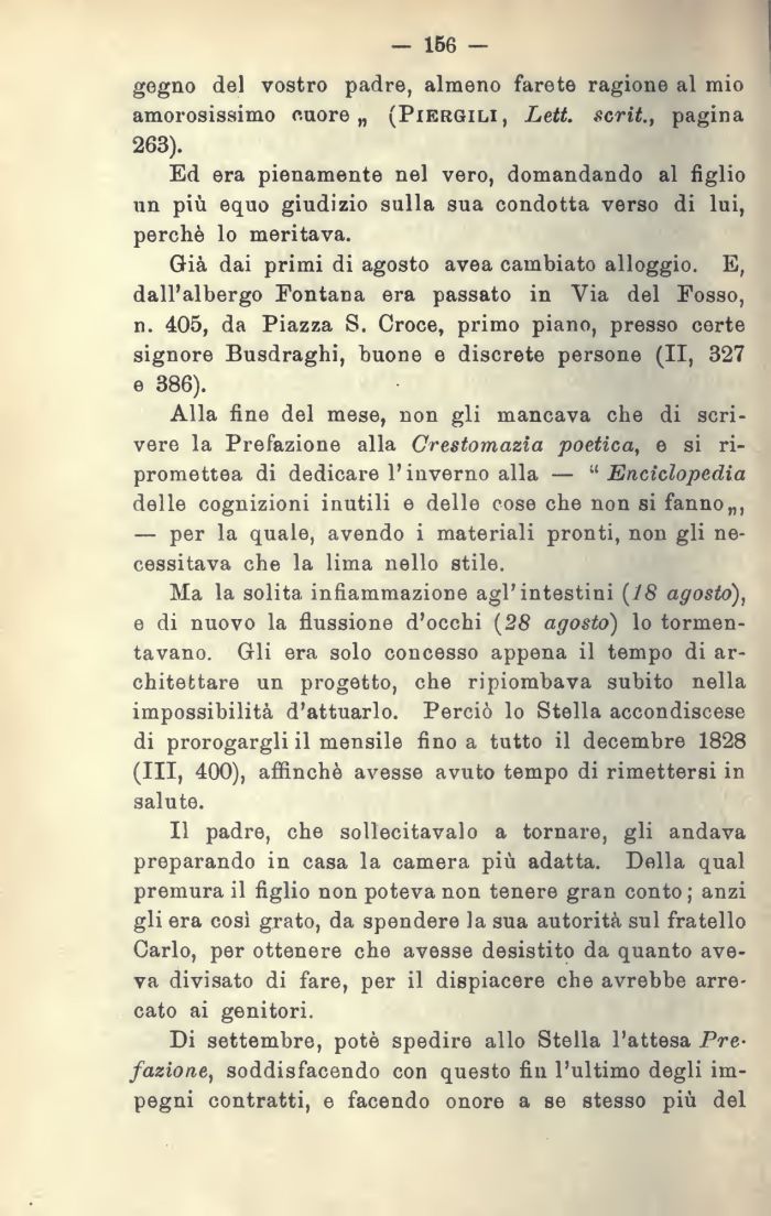 Ma la solita infiammazione agl'intestini (18 agosto), e di nuovo la flussione d'occhi (28 agosto) lo tormentavano. Gli era solo concesso appena il tempo di architettare un progetto, che ripiombava subito nella impossibilità d'attuarlo. Perciò lo Stella accondiscese di prorogargli il mensile fino a tutto il decembre 1828 (III, 400), affinchè avesse avuto tempo di rimettersi in salute.
