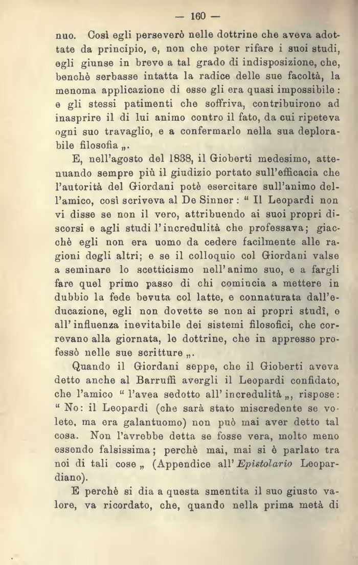 E, nell'agosto del 1838, il Gioberti medesimo, attenuando sempre più il giudizio portato sull'efficacia che l'autorità del Giordani potè esercitare sull'animo dell'amico, così scriveva al De Sinner : Il Leopardi non vi disse se non il vero, attribuendo ai suoi propri discorsi e agli studi l'incredulità che professava; giacché egli non era uomo da cedere facilmente alle ragioni dogli altri; e se il colloquio col Giordani valse a seminare lo scetticismo nell'animo suo, e a fargli fare quel primo passo di chi comincia a mettere in dubbio la fede bevuta col latte, e connaturata dall'educazione, egli non dovette se non ai propri studi, o all' influenza inevitabile dei sistemi filosofici, che correvano alla giornata, lo dottrine, che in appresso professò nelle sue scritture „.