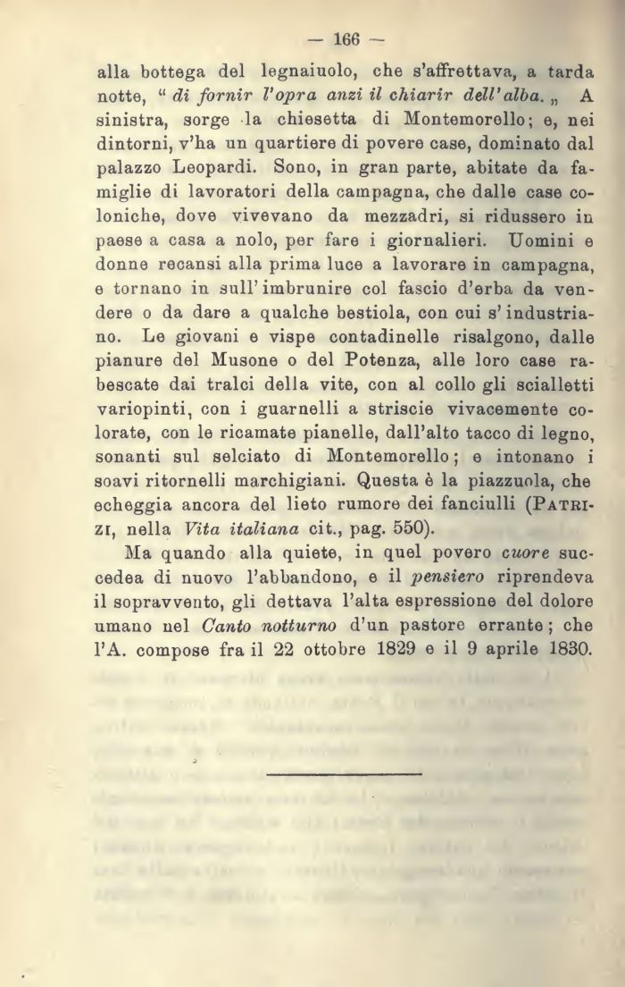 alla bottega del legnaiuolo, che s'affrettava, a tarda notte, di fornir l'opra anzi il chiarir dell' alba. „ A sinistra, sorge la chiesetta di Montemorello ; e, nei dintorni, v'ha un quartiere di povere case, dominato dal palazzo Leopardi. Sono, in gran parte, abitate da famiglie di lavoratori della campagna, che dalle case coloniche, dove vivevano da mezzadri, si ridussero in paese a casa a nolo, per fare i giornalieri. Uomini e donne recansi alla prima luce a lavorare in campagna, e tornano in sull'imbrunire col fascio d'erba da vendere o da dare a qualche bestiola, con cui s'industriano. Le giovani e vispe contadinelle risalgono, dalle pianure del Musone o del Potenza, alle loro case rabescate dai tralci della vite, con al collo gli scialletti variopinti, con i guarnelli a striscio vivacemente colorate, con le ricamate pianelle, dall'alto tacco di legno, sonanti sul selciato di Montemorello ; e intonano i soavi ritornelli marchigiani. Questa è la piazzuola, che echeggia ancora del lieto rumore dei fanciulli (Patrizi, nella Vita italiana cit., pag. 550).