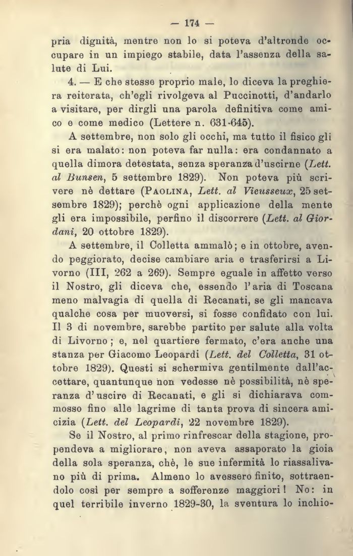 4. — E che stesse proprio male, lo diceva la preghiera reiterata, ch'egli rivolgeva al Puccinotti, d'andarlo a visitare, per dirgli una parola definitiva come amico e come medico (Lettere n. 631-645).