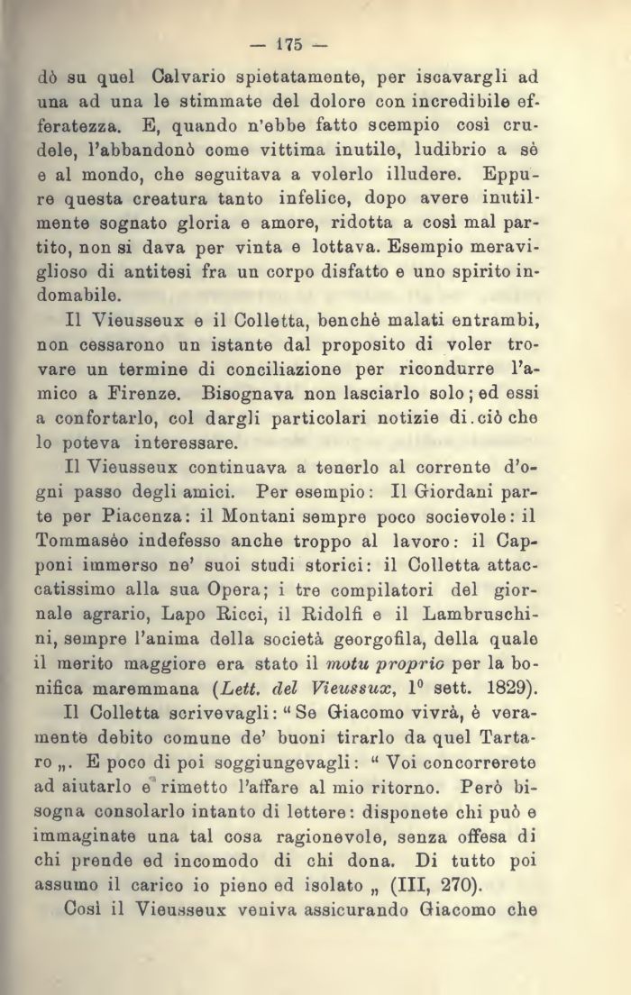 Il Vieusseux e il Colletta, benché malati entrambi, non cessarono un istante dal proposito di voler trovare un termine di conciliazione per ricondurre l'amico a Firenze. Bisognava non lasciarlo solo ; ed essi a confortarlo, col dargli particolari notizie di.ciò che
