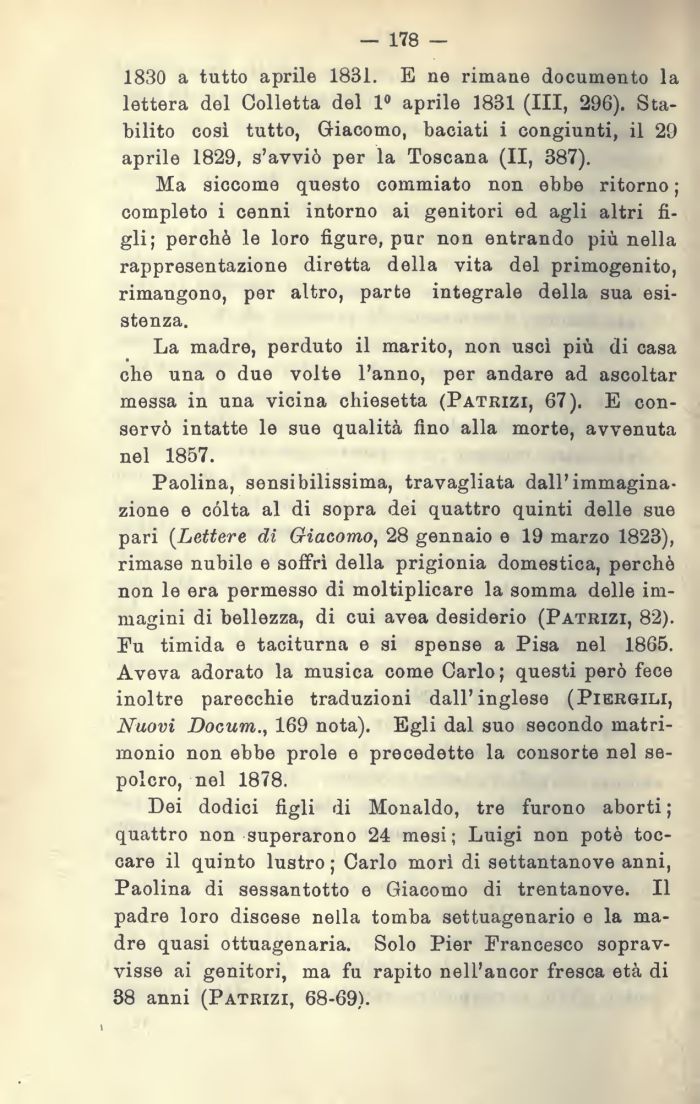Ma siccome questo commiato non ebbe ritorno ; completo i cenni intorno ai genitori ed agli altri figli; perchè le loro figure, pur non entrando più nella rappresentazione diretta della vita del primogenito, rimangono, per altro, parte integrale della sua esistenza.