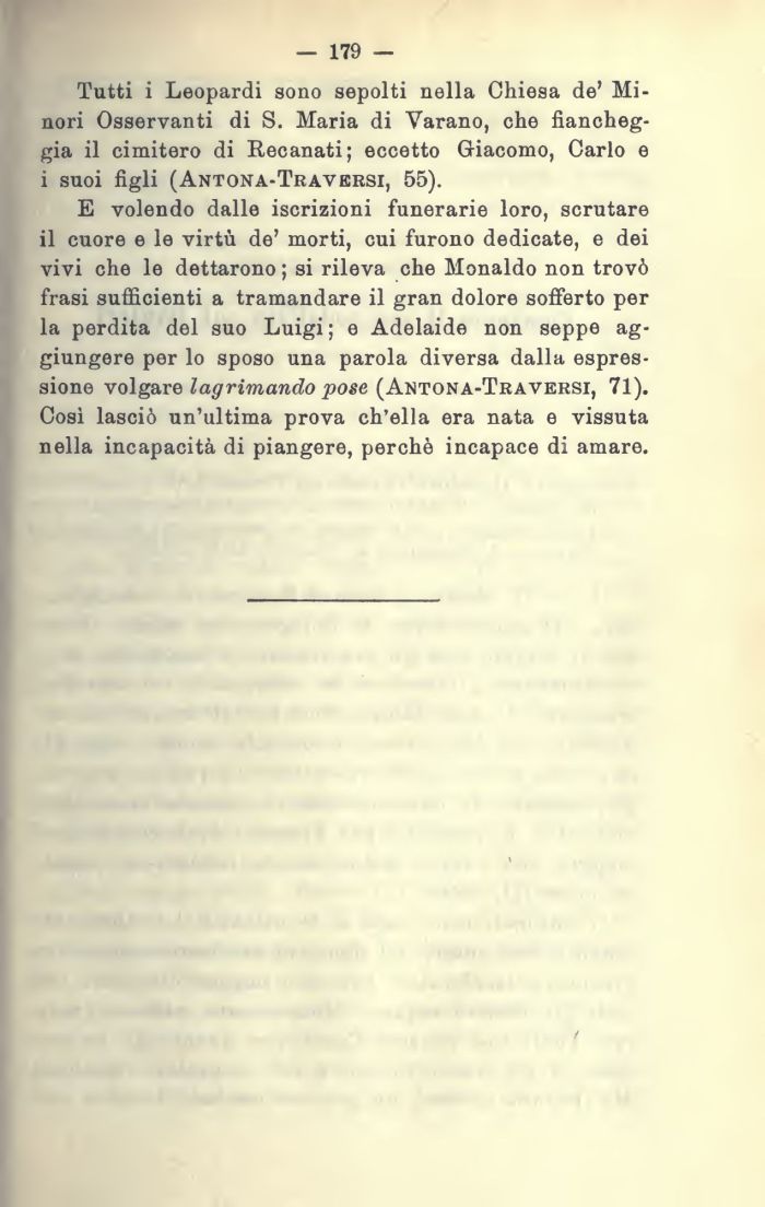 E volendo dalle iscrizioni funerarie loro, scrutare il cuore e le virtù de' morti, cui furono dedicate, e dei vivi che le dettarono ; si rileva che Monaldo non trovò frasi sufficienti a tramandare il gran dolore sofferto per la perdita del suo Luigi ; e Adelaide non seppe aggiungere per lo sposo una parola diversa dalla espressione volgare lagrimando pose (Antona-Traversi, 71). Così lasciò un'ultima prova ch'ella era nata e vissuta nella incapacità di piangere, perchè incapace di amare.