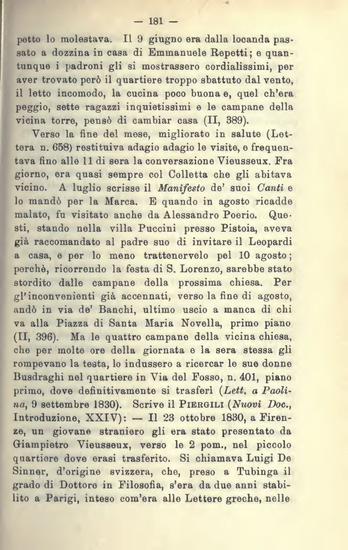 Verso la fine del mese, migliorato in salute (Lettera n. 658) restituiva adagio adagio le visite, e frequentava fino alle 11 di sera la conversazione Vieusseux. Fra giorno, era quasi sempre col Colletta che gli abitava vicino. A luglio scrisse il Manifesto de' suoi Canti e lo mandò per la Marca. E quando in agosto ricadde malato, fu visitato anche da Alessandro Poerio. Questi, stando nella villa Puccini presso Pistoia, aveva già raccomandato al padre suo di invitare il Leopardi a casa, e per lo meno trattenervelo pel 10 agosto ; perchè, ricorrendo la festa di S. Lorenzo, sarebbe stato stordito dalle campane della prossima chiesa. Per gl'inconvenienti già accennati, verso la fine di agosto, andò in via de' Banchi, ultimo uscio a manca di chi va alla Piazza di Santa Maria Novella, primo piano (II, 396). Ma le quattro campane della vicina chiesa, che per molte ore della giornata e la sera stessa gli rompevano la testa, lo indussero a ricercar le sue donne Busdraghi nel quartiere in Via del Fosso, n. 401, piano primo, dove definitivamente si trasferi (Lett. a Paolina, 9 settembre 1830). Scrive il Piergili (Nuovi Doc., Introduzione, XXIV): — Il 23 ottobre 1830, a Firenze, un giovane straniero gli era stato presentato da Giampietro Vieusseux, verso le 2 pom., nel piccolo quartiere dove erasi trasferito. Si chiamava Luigi De Sinner, d'origine svizzera, che, preso a Tubinga il grado di Dottore in Filosofia, s'era da due anni stabilito a Parigi, inteso com'era alle Lettere greche, nelle