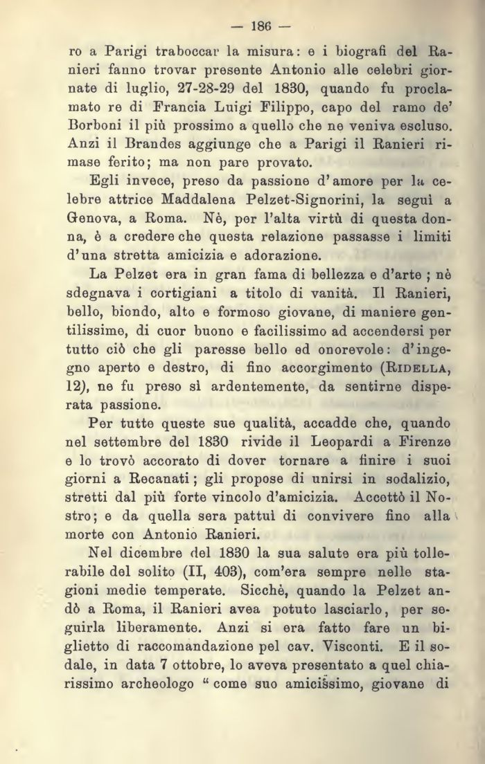 Nel dicembre del 1830 la sua salute era più tollerabile del solito (II, 403), com'era sempre nelle stagioni medie temperate. Sicché, quando la Pelzet andò a Roma, il Ranieri avea potuto lasciarlo, per seguirla liberamente. Anzi si era fatto fare un biglietto di raccomandazione pel cav. Visconti. E il sodale, in data 7 ottobre, lo aveva presentato a quel chiarissimo archeologo come suo amicissimo, giovane di