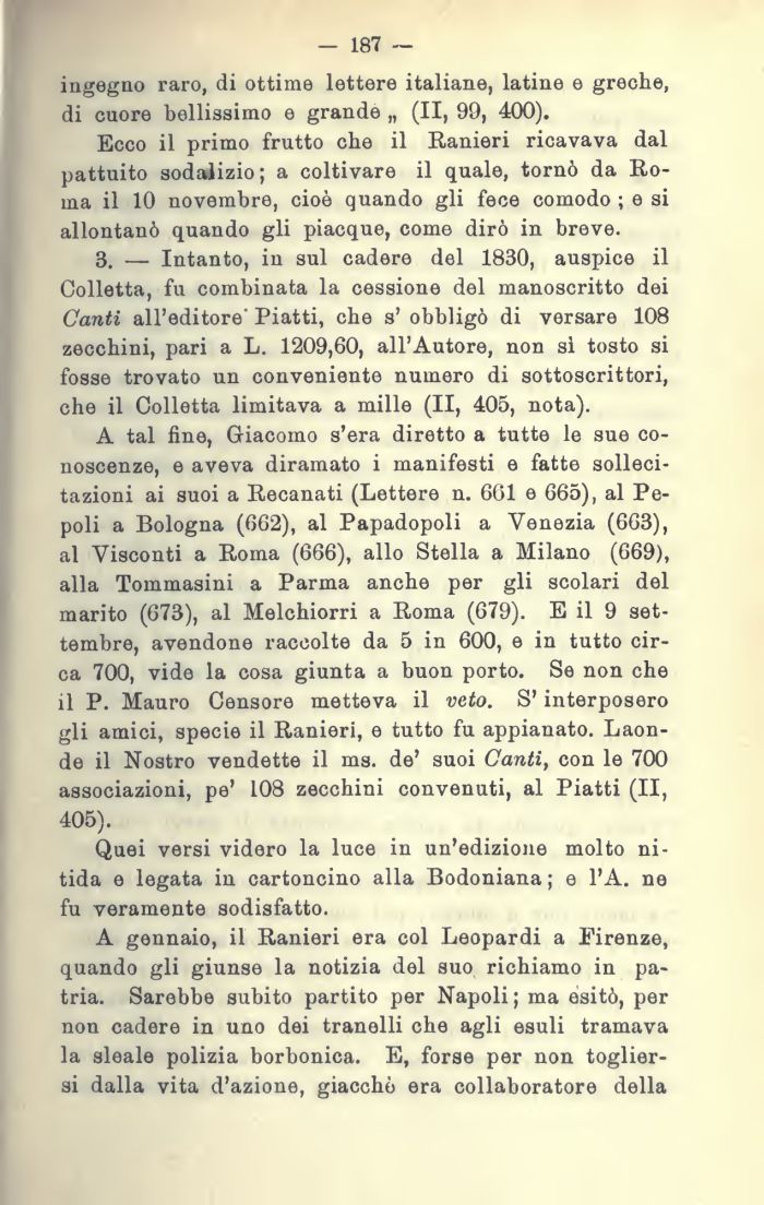 3. — Intanto, in sul cadere del 1830, auspice il Colletta, fu combinata la cessione del manoscritto dei Canti all'editore' Piatti, che s' obbligò di versare 108 zecchini, pari a L. 1209,60, all'Autore, non sì tosto si fosse trovato un conveniente numero di sottoscrittori, che il Colletta limitava a mille (II, 405, nota).