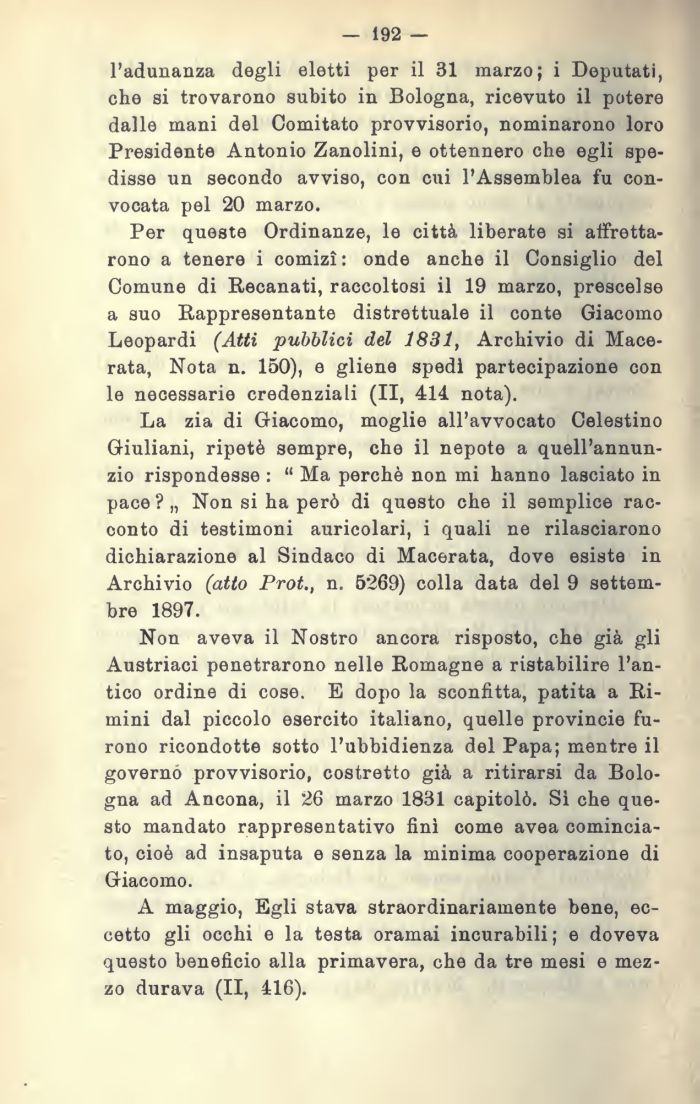 Per queste Ordinanze, le città liberate si affrettarono a tenere i comizi : onde anche il Consiglio del Comune di Recanati, raccoltosi il 19 marzo, prescelse a suo Rappresentante distrettuale il conte Giacomo Leopardi (Atti pubblici del 1831, Archivio di Macerata, Nota n. 150), e gliene spedi partecipazione con le necessarie credenziali (II, 414. nota).