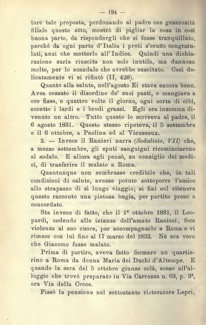 Sta invece di fatto, che il 1° ottobre 1831, il Leopardi, cedendo alle istanze dell'amato Ranieri, fece violenza al suo cuore, per accompagnarlo a Roma e vi rimase con lui fino al 17 marzo del 1832. Nè era vero che Giacomo fosse malato.