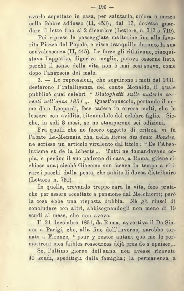 3. — Le repressioni, che seguirono i moti del 1831, destarono l'intelligenza del conte Monaldo, il quale pubblicò quei celebri Dialoghetti sulle materie correnti nell'anno 1831 „. Quest'opuscolo, portando il nome d'un Leopardi, fece cadere in errore molti, che lo lessero con avidità, ritenendolo del celebre figlio. Sicché, in soli 3 mesi, se ne stamparono sei edizioni.