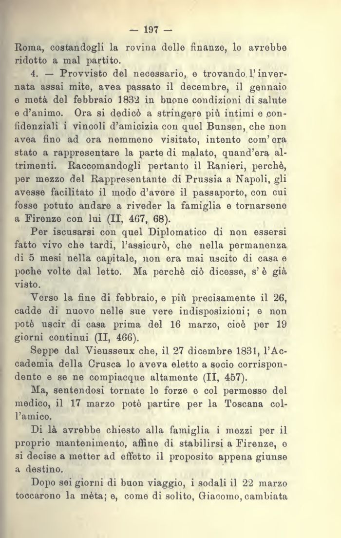 4. — Provvisto del necessario, e trovando. 1* invernata assai mite, avea passato il decembre, il gennaio e metà del febbraio 1832 in buone condizioni di salute e d'animo. Ora si dedicò a stringere più intimi e .confidenziali i vincoli d'amicizia con quel Bunsen, che non avea fino ad ora nemmeno visitato, intento com' era stato a rappresentare la parte di malato, quand'era altrimenti. Raccomandogli pertanto il Ranieri, perchè, per mezzo del Rappresentante di Prussia a Napoli, gli avesse facilitato il modo d'avere il passaporto, con cui fosse potuto andare a riveder la famiglia e tornarsene a Firenze con lui (II, 467, 68).