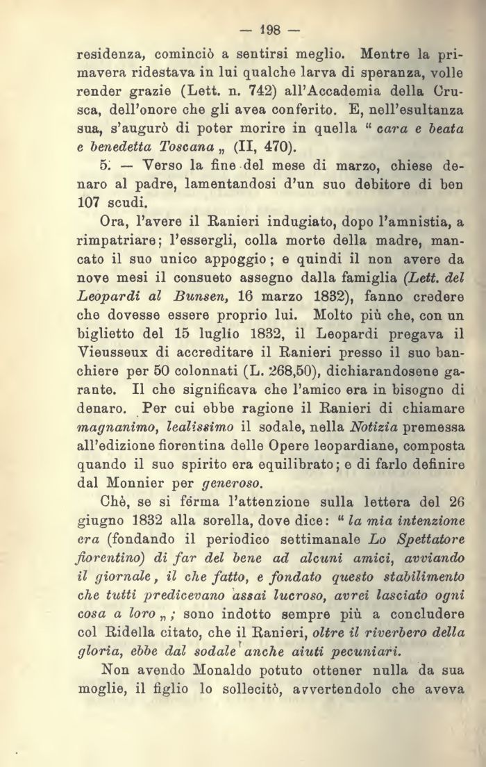 Ora, l'avere il Ranieri indugiato, dopo l'amnistia, a rimpatriare; l'essergli, colla morte della madre, mancato il suo unico appoggio ; e quindi il non avere da nove mesi il consueto assegno dalla famiglia (Lett. del Leopardi al Bunsen, 16 marzo 1832), fanno credere che dovesse essere proprio lui. Molto più che, con un biglietto del 15 luglio 1832, il Leopardi pregava il Vieusseux di accreditare il Ranieri presso il suo banchiere per 50 colonnati (L. 268,50), dichiarandosene garante. Il che significava che l'amico era in bisogno di denaro. Per cui ebbe ragione il Ranieri di chiamare magnanimo, lealissimo il sodale, nella Notizia premessa all'edizione fiorentina delle Opere leopardiane, composta quando il suo spirito era equilibrato; e di farlo definire dal Mounier per generoso.