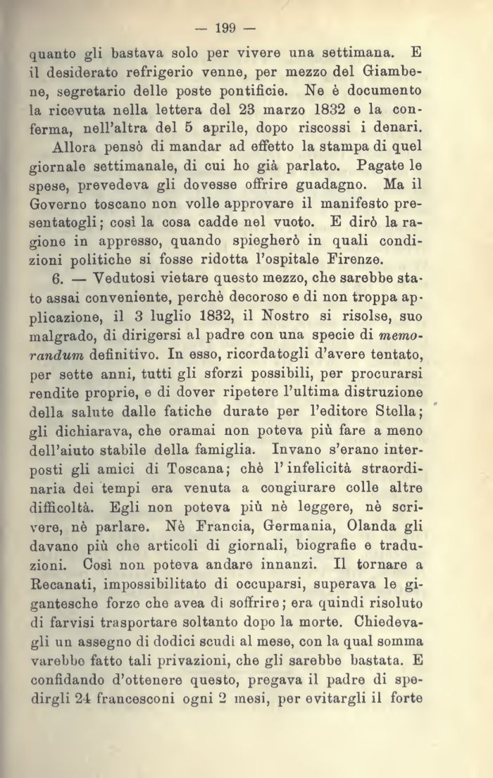 6. — Vedutosi vietare questo mezzo, che sarebbe stato assai conveniente, perchè decoroso e di non troppa applicazione, il 3 luglio 1832, il Nostro si risolse, suo malgrado, di dirigersi al padre con una specie di memorandum definitivo. In esso, ricordatogli d'avere tentato, per sette anni, tutti gli sforzi possibili, per procurarsi rendite proprie, e di dover ripetere l'ultima distruzione della salute dalle fatiche durate per l'editore Stella; gli dichiarava, che oramai non poteva più fare a meno dell'aiuto stabile della famiglia. Invano s'erano interposti gli amici di Toscana; chè l'infelicità straordinaria dei tempi era venuta a congiurare colle altre difficoltà. Egli non poteva più nò leggere, nè scrivere, nè parlare. Nè Francia, Germania, Olanda gli davano più che articoli di giornali, biografie e traduzioni. Così non poteva andare innanzi. Il tornare a Recanati, impossibilitato di occuparsi, superava le gigantesche forzo che avea di soffrire ; era quindi risoluto di farvisi trasportare soltanto dopo la morte. Chiedeva-gli un assegno di dodici scudi al mese, con la qual somma varebbo fatto tali privazioni, che gli sarebbe bastata. E confidando d'ottenere questo, pregava il padre di spedirgli 24 francesconi ogni 2 mesi, per evitargli il forte