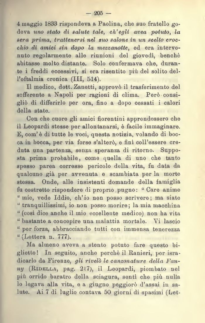 Con che cuore gli amici fiorentini apprendessero che il Leopardi stesse per allontanarsi, è facile immaginare. E, com'è di tutte le voci, questa notizia, volando di bocca in bocca, per via forse s'alterò, e fini coll'essere creduta una partenza, senza speranza di ritorno. Supposta prima probabile, come quella di uno che tanto spesso parea corresse pericolo della vita, fu data da qualcuno già per avvenuta e scambiata per la morte stessa. Onde, alle insistenti domande della famiglia fu costretto rispondere di proprio pugno: Care anime mie, vede Iddio, ch'io non posso scrivere; ma siate tranquillissimi, io non posso morire; la mia macchina (così dice anche il mio eccellente medico) non ha vita bastante a concepire una malattia mortale. Vi lascio per forza, abbracciando tutti con immensa tenerezza (Lettera n. 777).
