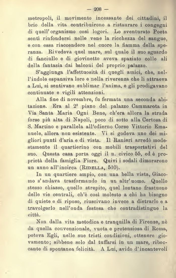 Alla fine di novembre, fu fermata una seconda abitazione. Era al 2° piano del palazzo Cammarota in Via Santa Maria Ogni Bene, ch'era allora la strada forse più alta di Napoli, poco di sotto alla Certosa di S. Martino e parallela all'odierno Corso Vittorio Emanuele, allora non esistente. Vi si godeva uno dei migliori punti d'aria e di vista. Il Ranieri arredò modestamente il quartierino con mobili trasportativi del suo. Questa casa porta oggi il n. civico 55, ed è proprietà della famiglia Fiore. Quivi i sodali dimorarono un anno all'incirca (Ridella, 510).