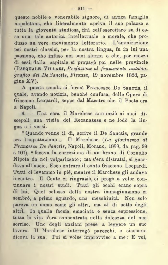Quando venne il di, scrive il De Sanctis, grande era l'aspettazione,,. Il Marchese (La giovinezza di Francesco De Sanctis, Napoli, Morano, 1889, da pag. 99 a 101), faceva la correzione di un brano di Cornelio Nipote da noi volgarizzato ; ma s'era distratti, si guardava all'uscio. Ecco entrare il conte Giacomo Leopardi. Tutti ci levammo in piò, mentre il Marchese gli andava incontro. Il Conte ci ringraziò, ci pregò a voler continuare i nostri studi. Tutti gli occhi erano sopra di lui. Quel colosso della nostra immaginazione ci sembrò, a primo sguardo, una meschinità. Non solo pareva un uomo come gli altri, ma al di sotto degli altri. In quella faccia emaciata e senza espressione, tutta la vita s'era concentrata nella dolcezza del suo sorriso. Uno degli anziani prese a leggere un suo lavoro. Il Marchese interrogò parecchi, e ciascuno dicova la sua. Poi si volse improvviso a mo: E voi,