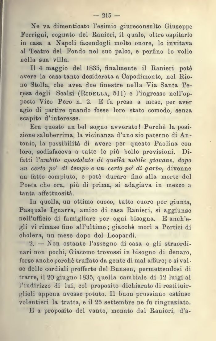 In quella, un ottimo cuoco, tutto cuore per giunta, Pasquale Ignarra, amico di casa Ranieri, si aggiunse nell'ufficio di famigliare per ogni bisogna. E anch'e-gli vi rimase fino all'ultimo; giacché morì a Portici di cholera, un mese dopo del Leopardi.