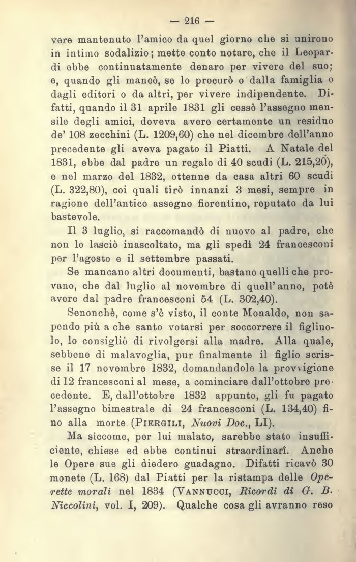 Ma siccome, per lui malato, sarebbe stato insufficiente, chiese ed ebbe continui straordinari. Anche le Opere sue gli diedero guadagno. Difatti ricavò 30 monete (L. 168) dal Piatti per la ristampa delle Operette morali nel 1834 (Vannucoi, Ricordi di G. B. Niccolini, voi. I, 209). Qualche cosa gli avranno reso