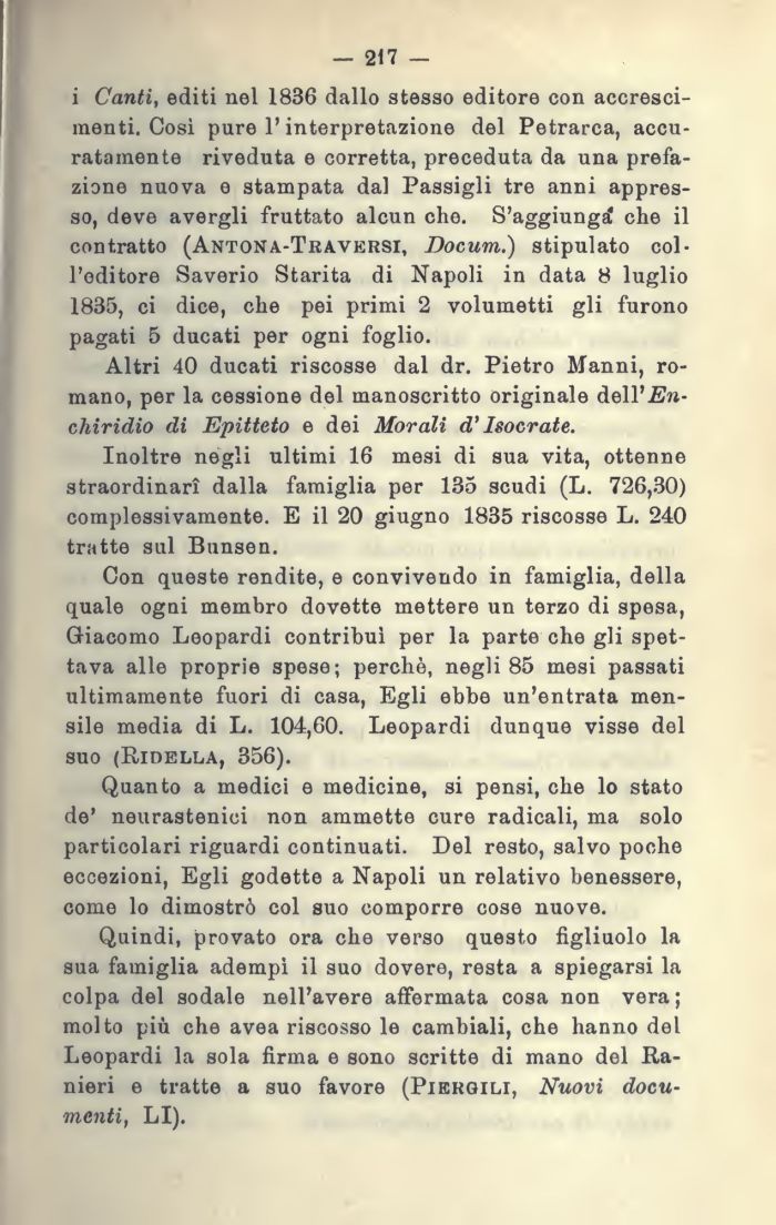 i Canti, editi nel 1836 dallo stesso editore con accrescimenti. Così pure l'interpretazione del Petrarca, accuratamente riveduta e corretta, preceduta da una prefazione nuova e stampata dal Passigli tre anni appresso, deve avergli fruttato alcun che. S'aggiungi che il contratto (Antona-Traversi, Docum.) stipulato col-l'editore Saverio Starita di Napoli in data 8 luglio 1835, ci dice, che pei primi 2 volumetti gli furono pagati 5 ducati per ogni foglio.