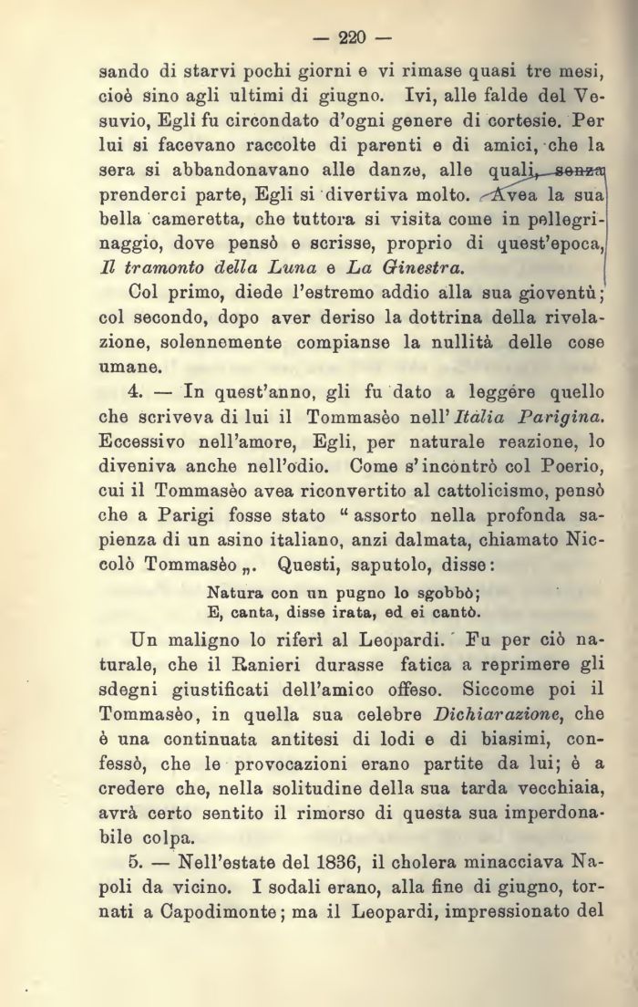 Un maligno lo riferì al Leopardi. Eu per ciò naturale, che il Ranieri durasse fatica a reprimere gli sdegni giustificati dell'amico oifeso. Siccome poi il Tommasèo, in quella sua celebre Dichiarazione, che è una continuata antitesi di lodi e di biasimi, confessò, che le provocazioni erano partite da lui; è a credere che, nella solitudine della sua tarda vecchiaia, avrà certo sentito il rimorso di questa sua imperdonabile colpa.