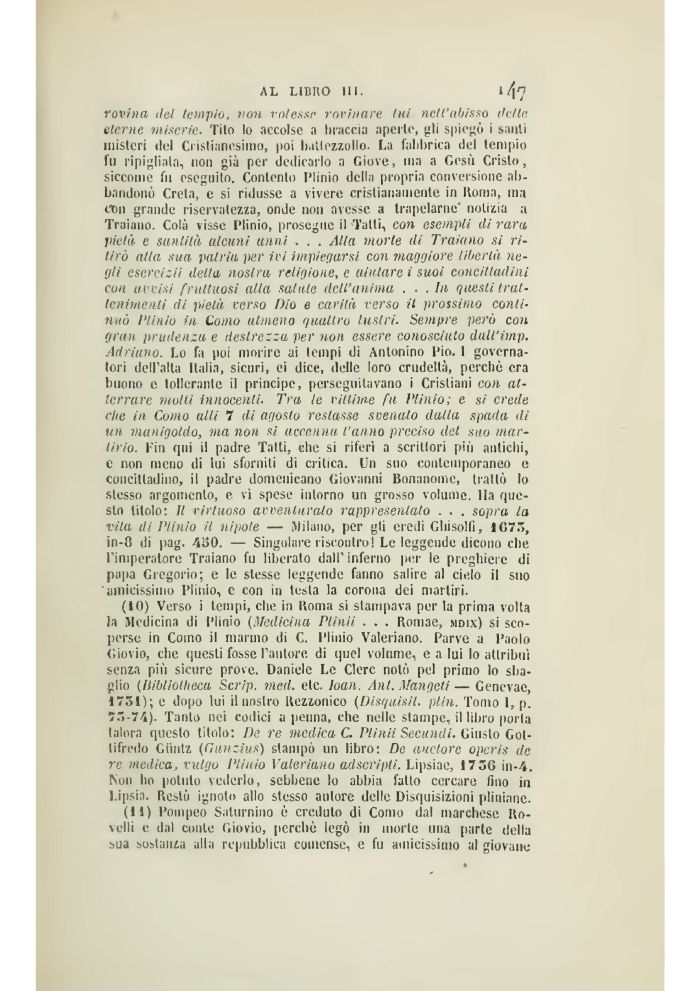 rovina tlel tempio» non volessi» rovinare lui nell'abisso delle eterne miserie. Tito lo accolse a braccia aperte, gli spiegò i santi misteri del Cristianesimo, poi hatlezzollo. La fabbrica del tempio fu ripigliala, non già per dedicarlo a Giove, ma a Gesù Cristo, siccome fu eseguito. Contento Plinio della propria conversione abbandonò Creta, e si ridusse a vivere cristianamente in Roma, ma con grande riservatezza, onde non avesse a trapelarne notizia a Traiano. Colà visse Plinio, prosegue il Tatti, con esempli di rara pietà e santità alcuni anni . . . Alla morte di Traiano si ritirò atla sua patria per ivi impiegarsi con maggiore libertà negli csercizii detta nasini religione, c aiutare i suoi concittadini con avvisi fruttuosi alla salute dell'anima ... In questi trattenimenti di pietà verso Dio e carità verso U prossimo continuò Plinio in Como almeno quattro lustri. Sempre però con gram> prudenza e destrezza per non essere conosciuto duli'imp. Adriano. Lo fa poi morire ai tempi di Antonino Pio. I governatori dell'alta Italia, sicuri, ei dice, delle loro crudeltà, perchè era buono e. tollerante il principe, perseguitavano ì Cristiani con atterrare molti innocenti. Tra le vittime fu Plinio; e si crede che in Como alti 7 di agosto restasse svenato dalla spada di un manigoldo, ma non si accenna l'anno preciso del suo martirio. Fin qui il padre Tatti, che sì riferì a scrittori più antichi, e non meno di lui sforniti di critica. Un suo contemporaneo e concittadino, il padre domenicano Giovanni Bonanome, trattò lo stesso argomento, e vi spese intorno un grosso volume. Ha questo titolo: Il virtuoso avventurato rappresentato . . . sopra la vita ili Plinio il nipote — Milano, per gti eredi Ghisolfi, 1075, in-8 di pag. 4o0. — Singolare riscontro! Le leggende dicono che l'imperatore Traiano fu liberalo dall' inferno per le preghiere di papa Gregorio; e le stesse leggende fanno salire al cielo il suo amicissimo Plinio, e con in testa la corona dei martiri.