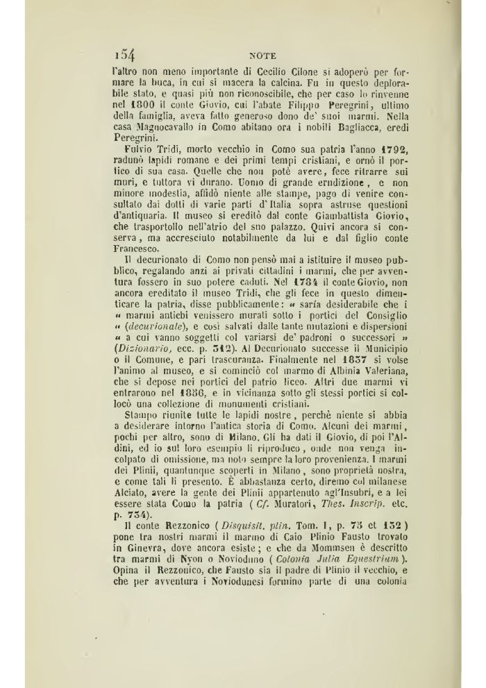 Slampo riunite tutte le lapidi nostre , perchè niente si abbia a desiderare intorno l'aulica storia di Como. Alcuni dei marmi, pochi per altro, sono di Milano. Gli ha dati il Giovio, di poi l'Aldini, ed io su! loro esempio li riproduco , onde non venga incolpato di omissione, ma nolo sempre !a loro provenienza. 1 marmi dei Plinii, quantunque scoperti in Milano, sono proprietà nostra, e come tali li presento. È abbastanza certo, diremo col milanese Alciato, avere la gente dei Plinii appartenuto agl'Insubri, e a lei essere stata Como la patria ( Cf. Muratori, Thes. Inscrip. etc. p. 754).