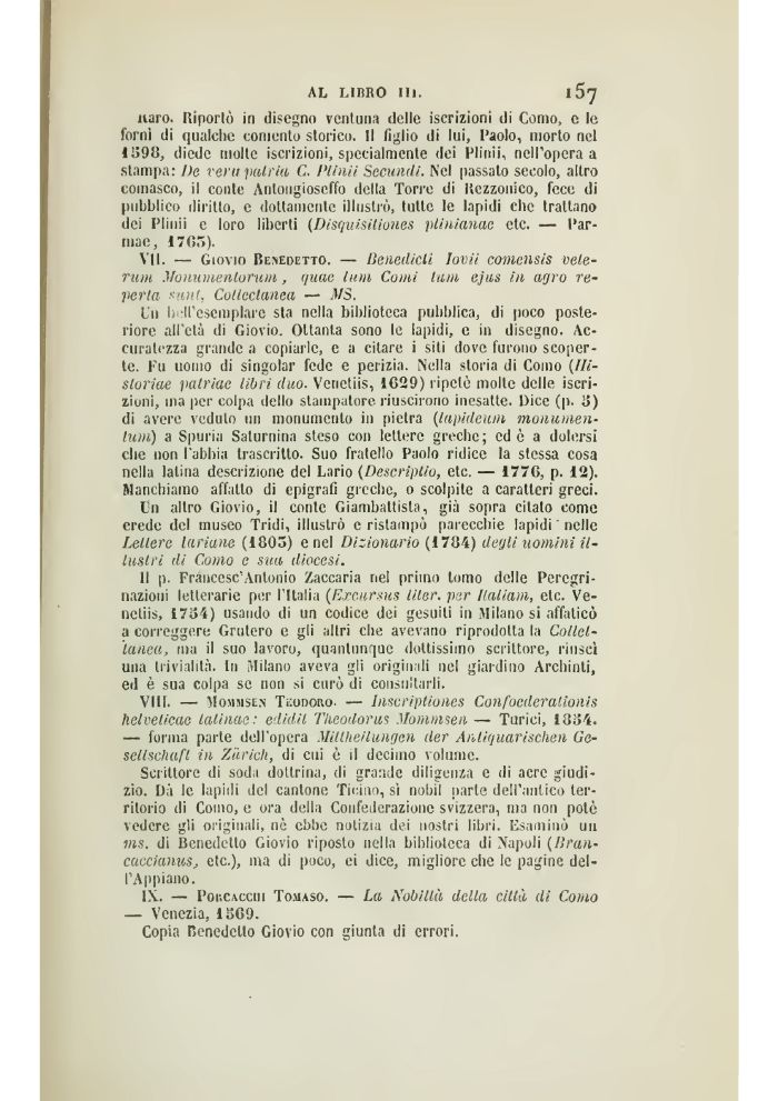 naro. Riporlo in disegno ventuna delle iscrizioni di Como, e le fornì di qualche comento storico. Il figlio di lui, Paolo, morto nel 11598, diede molte iscrizioni, specialmente dei Plinii, nell'opera a stampa: De veni patria C. Plinii Secundi. Nel passato secolo, altro comasco, il conte Anlougioscffo della Torre di Kezzonico, fece di pubblico diritto, e dottamente illustrò, tutte le lapidi che trattano dei Plinii e loro liberti (Disquisitiones plinianac etc. — Par-mae, 17G5).