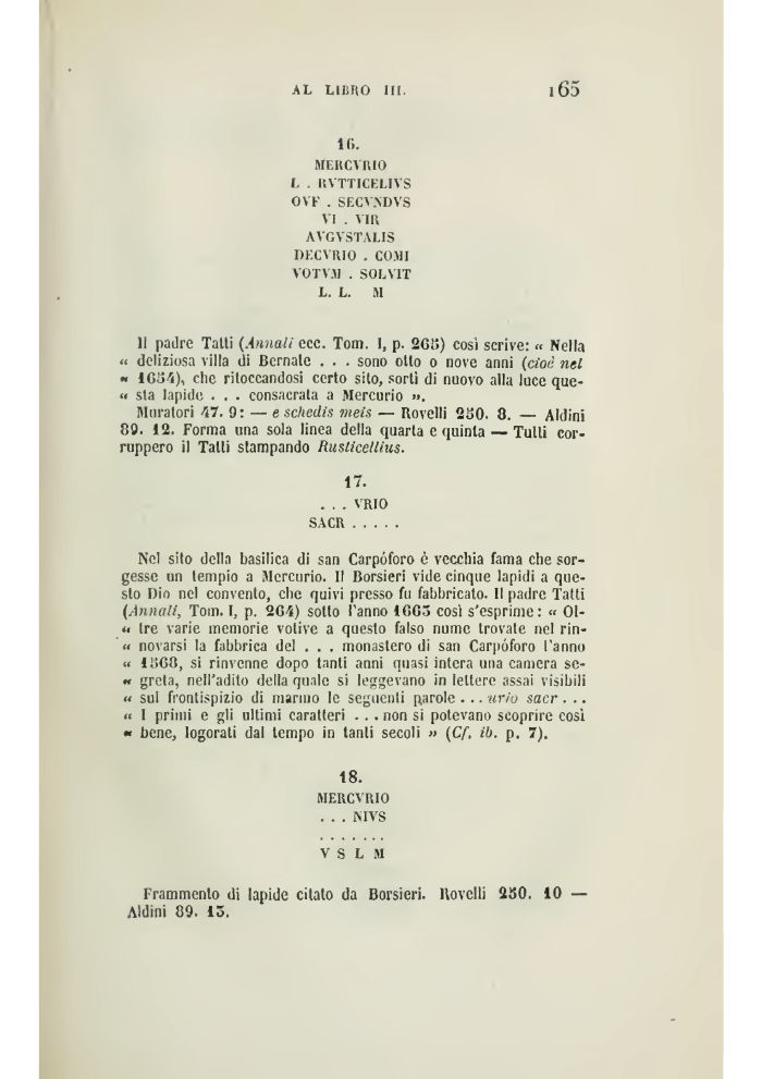 Nel sito della basilica di san Carpóforo è vecchia fama che sorgesse un tempio a Mercurio. Il Borsieri vide cinque lapidi a questo Dio nel convento, che quivi presso fu fabbricato. Il padre Tatti (Annali, Tom. I, p. 264) sotto Tanno 1665 così s'esprime: « Olii tre varie memorie votive a questo falso nume trovate nel rin-« novarsi la fabbrica del . . . monastero di san Carpóforo l'anno « 1568, si rinvenne dopo tanti anni quasi intera una camera se-« greta, nell'adito della quale si leggevano in lettere assai visibili « sul frontispizio di marmo le seguenti parole ... urio sacr. .. (t I primi e gli ultimi caratteri . .. non si potevano scoprire cosi « bene, logorati dal tempo in tanli secoli » (Cf. ib. p. 7).