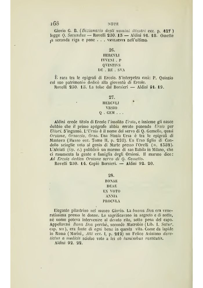 Giovio G. B. ( Dizionario degli uomini illustri ecc. p. 427 ) legge Q. Secundus — Rovelli 230. io — Aldini 91. 18. Omette ja seconda riga e pone . . . vssiuenvs Dell'ultima.