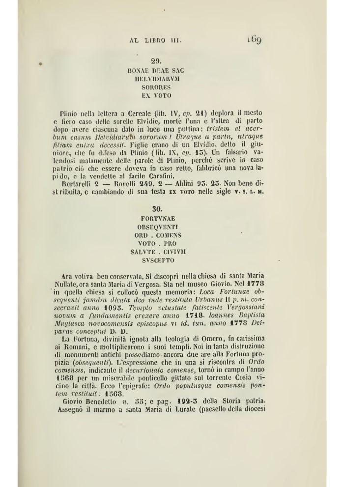 La Fortuna, divinila ignota alla teologia di Omero, fu carissima ai Romani, e moltiplicarono i suoi templi. Noi in tanta distruzione di monumenti antichi possediamo -ancora due are alla Fortuna propizia (obsequenti). L'espressione che in una si riscontra di Ordo comensis, indicante il decurionato comense, tornò in campo l'anno 1568 per un miserabile ponticello gittato sul torrente Cosia vicino la città. Ecco l'epigrafe: Ordo populnsque comensis pon• lem restituii: 1568.