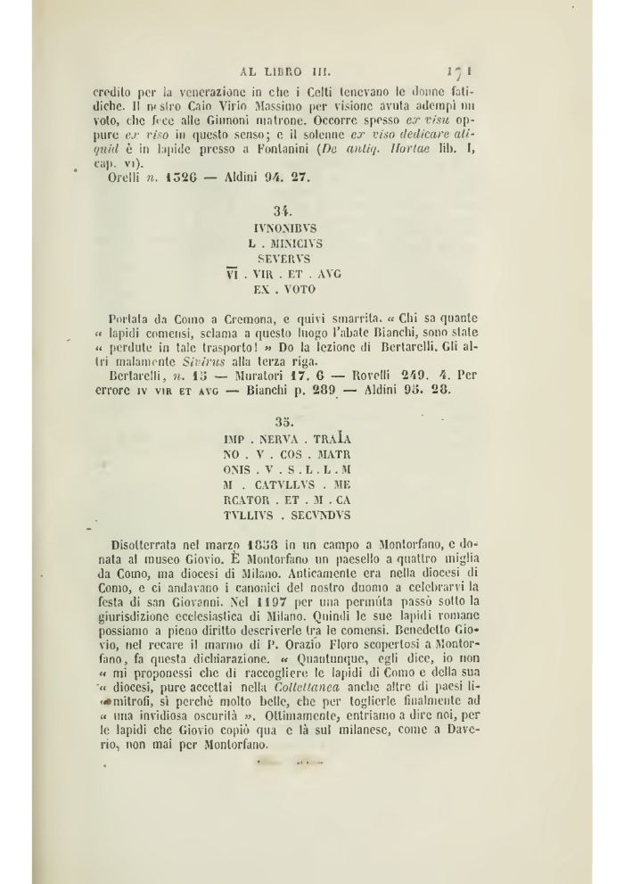 Disollerrata nel marzo 1833 in un campo a Monlorfano, e donata al museo Giovio. È Monlorfano un paesello a quattro miglia da Como, ma diocesi di Milano. Anticamente era nella diocesi di Como, e ci andavano i canonici del nostro duomo a celebrarvi la festa di san Giovanni. Nel 1197 per una permuta passò sotto la giurisdizione ecclesiastica di Milano. Quindi le sue lapidi romane possiamo a pieno diritto descriverle tra le comensi. Benedetto Giovio, nel recare il marmo di P. Orazio Floro scopertosi a Montor-fano, fa questa dichiarazione. « Quantunque, egli dice, io non « mi proponessi clic di raccogliere le lapidi di Como e della sua « diocesi, pure accettai nella Coltcllanea anche altre di paesi li-«®mitrofi, sì perchè molto belle, che per toglierle finalmente ad « una invidiosa oscurità ». Ottimamente, entriamo a dire noi, per le lapidi che Giovio copiò qua e là sul milanese, come a Davc-rio, non mai per Monlorfano.