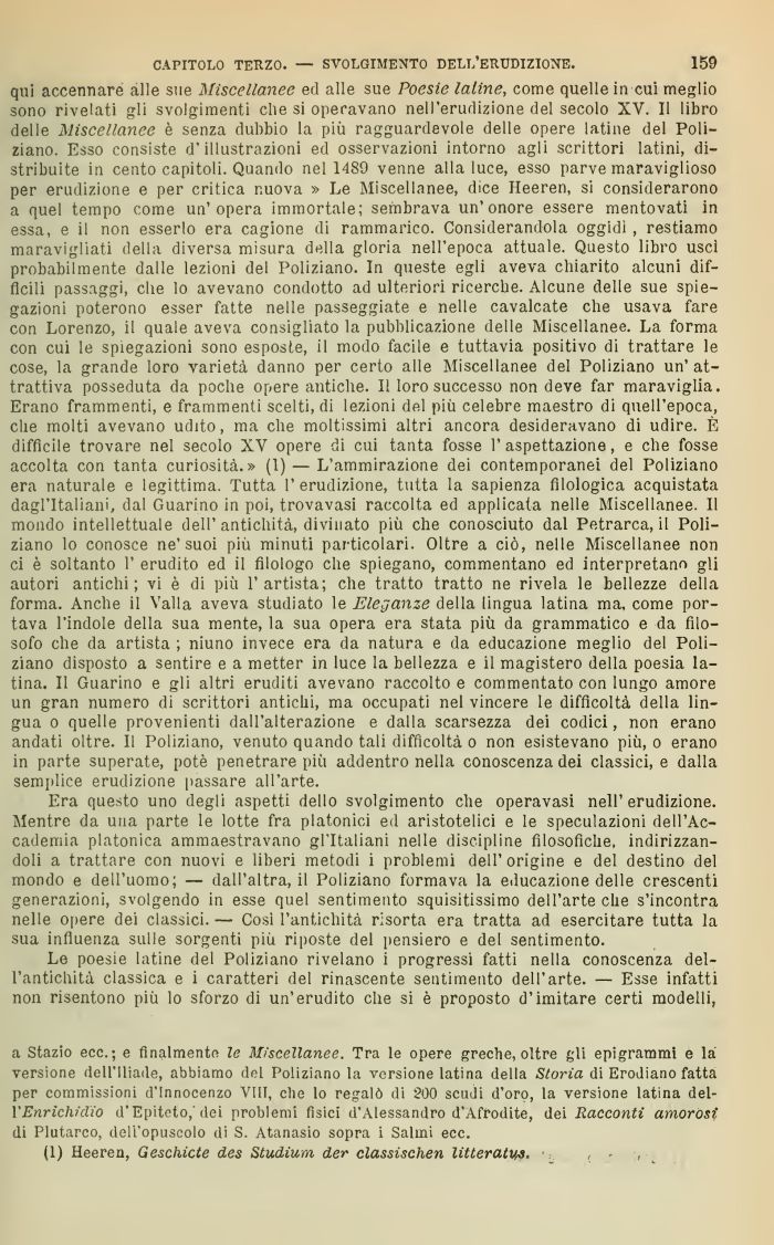 Era questo uno degli aspetti dello svolgimento che operavasi nell'erudizione. Mentre da una parte le lotte fra platonici ed aristotelici e le speculazioni dell'Accademia platonica ammaestravano gl'Italian nelle discipline filosofiche, indirizzandoli a trattare con nuovi e liberi metodi i problemi deil' origine e del destino del mondo e dell'uomo; — dall'altra, il Poliziano formava la educazione delle crescenti generazioni, svolgendo in esse quel sentimento squisitissimo dell'arte che s'incontra nelle opere dei classici. — Così l'antichità risorta era tratta ad esercitare tutta la sua influenza sulle sorgenti più riposte del pensiero e del sentimento.