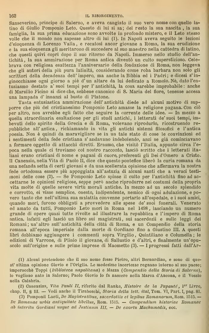 Sanseverino, principe di Salerno, e aveva cangiato il suo vero nome con quello latino di Giulio Pomponio Leto. Questo di lui si sa; del resto la sua nascita , la sua famiglia, la sua prima educazione sono avvolte in profondo mistero, e il Leto stesso volle che il mondo non sapesse altro di lui (1). In Napoli aveva seguito le lezioni d'eloquenza di Lorenzo Valla, e recatosi ancor giovane a Roma, la sua erudizione e la sua eloquenza gli meritarono di succedere al suo maestro nella cattedra éi latino, che questi quivi coprì dopo ii suo ritorno da Napoli, Immerso nello studio dell'antichità, la sua ammirazione per Roma antica diventò un culto superstizioso. Celebrava con religiosa esattezza l'anniversario della fondazione di Roma, non leggeva che gli autori della più pura latinità, considerando come roba barbara non solo gli scrittori dalla decadenza dell'impero, ma anche la Bibbia ed i Padri; e dicesi s'n-ginocchiasse ogni giorno a piè d' un altare da lui dedicato a Romolo. Nè, dato l'entusiasmo destato a'suoi tempi per l'antichità, la cosa sarebbe improbabile: anche di Marsilio Ficino si dice che, sebbene canonico di S. Maria del flore, tenesse accesa una lampada d'innanzi al busto di Platone.