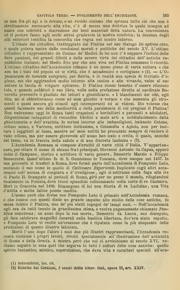 L'Accademia Romana si compose d'eruditi di varie città d'Italia. V'apparteii' nero, per citare 1 nome di alcuno frai pr incipali, Giovanni. Antonio da Capua, epperò detto il Campano, storico e scrittore di vario genere, Demetrio Marzio e Filippo Bonaccorsi. Quest'ultimo fu di S. Geminiano in Toscana, dove nacque nel 1437. In sua gioventù si trasferi a Roma, dove formò parte dell'Accademia di Poinpor io Leto, mutando il suo nome in quello di Callimaco Esperiente. Implicato cogl altri accademici nell' accusa di congiura e d'irreligione, egli si sottrasse colla fuga alle ire di Paolo II. Scampato ai pericoli di Roma, girò per un pezzo il mondo, rifugrandosi finalmente in Polonia, dove trovò splendido collocamento nella corte di re Casim.ro. Mori in Cracovia nel 1490. Rimangono di lui una Storia di re Ladislao, una Vita d'Attila e molte latine poesie inedite.