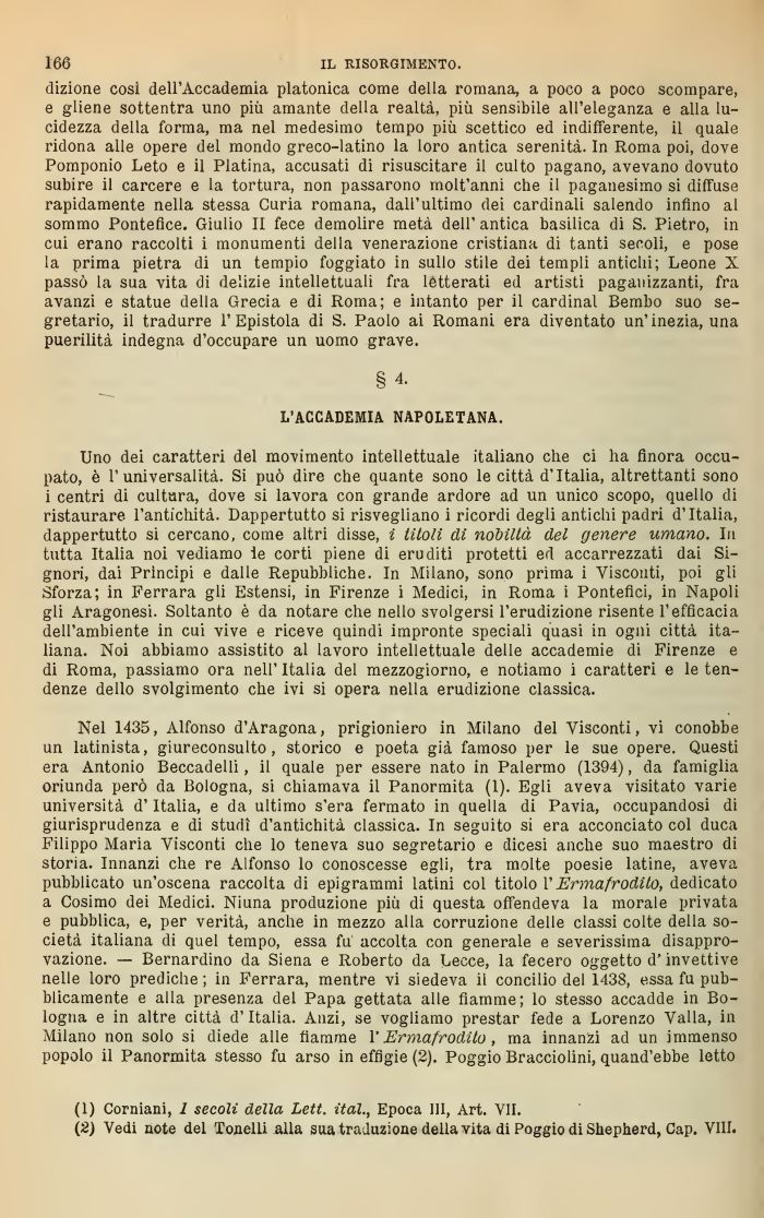 Nel 1435, Alfonso d'Aragona, prigioniero in Milano del Visconti, vi conobbe un latinista, giureconsulto, storico e poeta già famoso per le sue opere. Quest era Antonio Beccadelli, il quale per essere nato in Palermo (1304), da famiglia oriunda però da Bologna, si chiamava il Panormita (1). Egli aveva visitato varie università d'Italia, e da ultimo s'era fermato in quella di Pavia, occupandosi di giurisprudenza e di studi d'antichità classica. In seguito si era acconciato col duca Filippo Maria Visconti che lo teneva suo segretario e dicesi anche suo maestro di scoria. Innanzi che re Alfonso io conoscesse egli, tra molte poesie latine, aveva pubblicato un'oscena raccolta di epigrammi latini col titolo V Ermafrodito, dedicato a Cosimo dei Medici. Ninna produzione più di questa offendeva la morale privata e pubblica, e, per verità, anche in mezzo alla corruzione delle classi colte della società italiana di quel tempo, essa fu' accolta con generale e severissima disapprovazione. — Bernardino da Siena e Roberto da Lecce, la fecero oggetto d invettive nelle loro prediche ; in Ferrara, mentre vi siedeva il concilio del 1438, essa fu pubblicamente e alla presenza del Papa gettata alle fiamme; lo stesso accadde in Bologna e in altre città d'Italia. Anzi, se vogliamo prestar fede a Lorenzo Valla, i« Milano non solo si diede alle fiamme l'Ermafrodito , ma innanzi ad un immenso popolo il Panormita stesso fu arso in effigie (2). Poggio Bracciolini, quand'ebbe letto