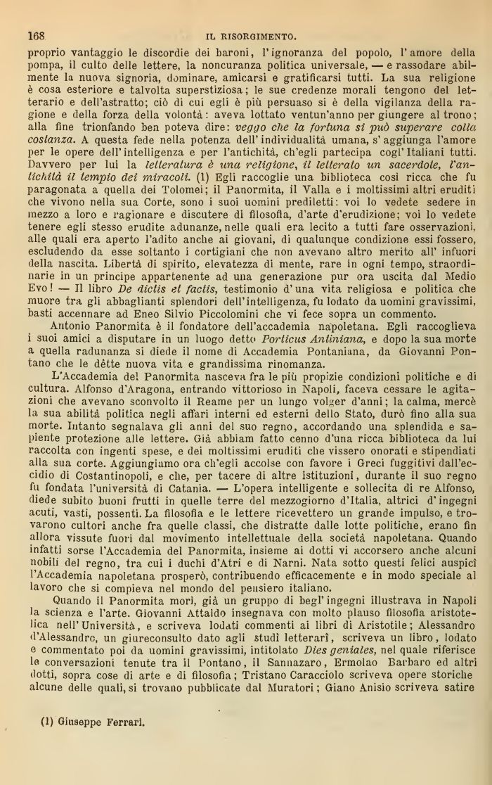 Antonio Panorrnita è il fondatore dell'accademia napoletana. Egli raccoglieva i suoi amici a disputare in un luogo detto Porticus Antiniana, e dopo la sua morte a quella radunanza si diede 11 nome di Accademia Pontaniana, da Giovanni Pon-tano che le détte nuova vita e grandissima rinomanza.