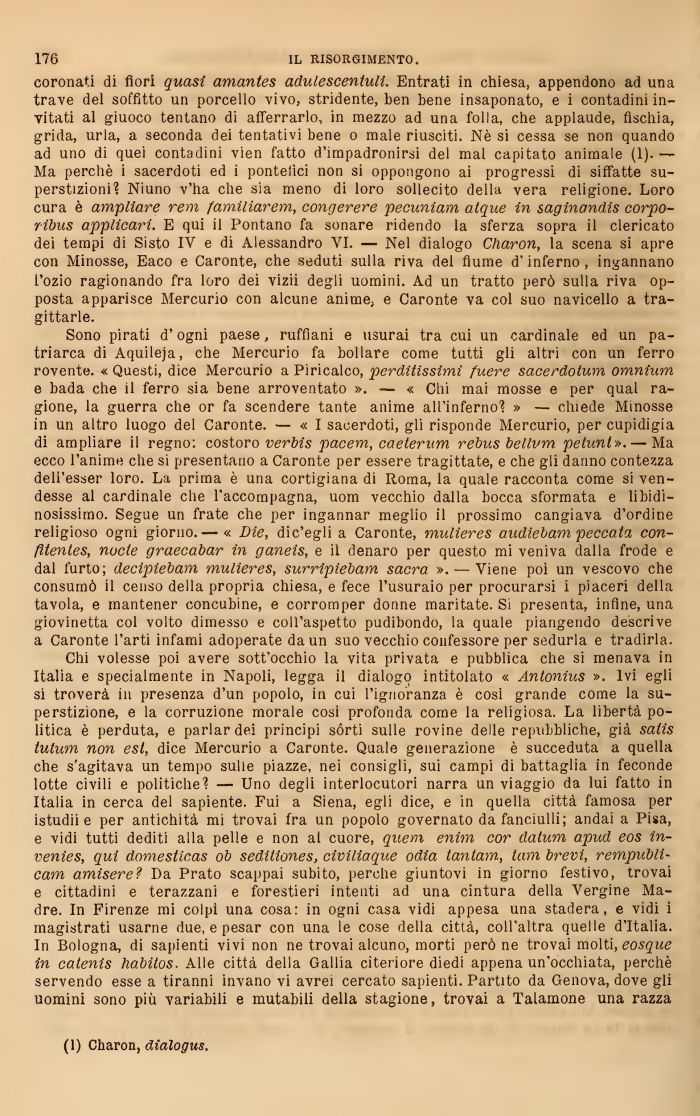 Chi volesse poi avere sott'occhio la vita privata e pubblica che s menava in Italia e specialmente in Napoli, legga il dialogo .ntitolato « Anionius ». lv. egl' si troverà in presenza d'un popolo, in cui l'ignoranza è cosi grande come la superstizione, e la corruzione morale così profonda come la religiosa. La libertà politica è perduta, e parlar dei principi sórti sulle rovine de'le repubbliche, già soiis tutum non est, dice Mercurio a Caronte. Quale generazione è succeduta a quella che s'agitava un tempo sulle piazze, nei consìgli, sui campi d battaglia flf feconde lotte civili e politiche? — Uno degli interlocutori narra un viaggio da lui fatto in Italia in cerca dei sapiente Fui a Siena, egli dice, e in quella città famosa per istudii e per antichità mi trovai fra un popolo governato da fanciulli; andai a Pisa, e vidi tutti dediti alla pelle e non al cuore, quan enim cor datum apud eos invenie s, qui domesticas ob seditiones, civiliaque odia tantum, tam brevi, rempubli-cam amisere? I)a Prato scappai subito, perche giuntovi in giorno festivo, trovai e cittadini e terazzani e forestieri intenti ad una cultura della Vergine Madre. In Firenze mi colpi una cosa: in ogni casa vidi appesa una stadera, e vidi : magistrati usarne due. e pesar con una le cose della città, coll'altra quelle d'Ita.ia. In Bologna, di sapienti vivi non ne trovai alcuno, morti però ne trovai molti, eosque in catcnis habitos. Alle città della Gallia citeriore diedi appena un'occhiata, perchè servendo esse a tiranni invano vi avre cercato sapienti. Partito da Genova, dove gl: uomini sono più variabili e mutabili della stagione, trovai a Talamone una razza