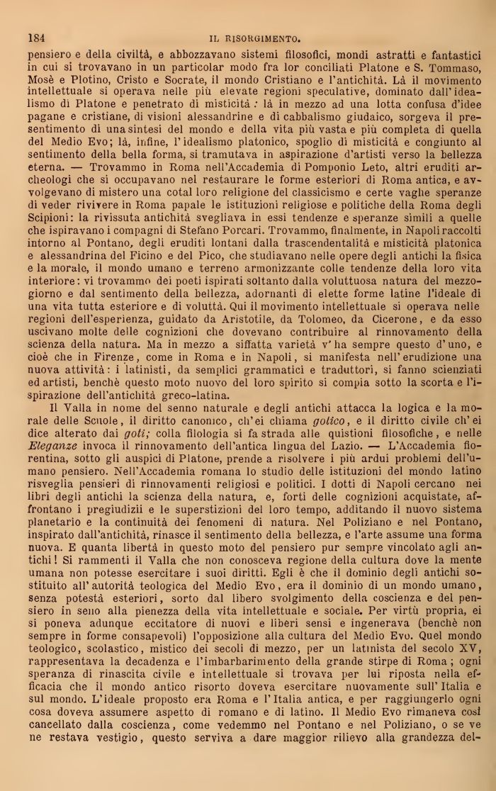 Il Valla in nome del senno naturale e degli antichi attacca la logica e la morale delle Scuole, il diritto canonico, ch'ei chiama gotico, e il di'itto civile eh'e' dice alterato dai goti; colla filologia si fa strada alle quistioni filosofiche, e nelle Eleganze invoca il rinnovamento dell'antica lingua del Lazio. — L'Accademia fiorentina, sotto gii auspici di Platone, prende a risolvere i più ardui problemi dell'umano penderò. Nell'Accademia romana lo studio delle istituzioni del mondo lat no risveglia pensier di rinnovamenti religiosi e politici. I dotti di Napol cercano ne; libr. degli antichi la scienza della natura, e, forti delle cognizioni acquistate, affrontano i pregiudizii e le superstizioni del loro tempo, additando il nuovo sistema planetario e la continuità dei fenomeni di natura. Nel Poliziano e nel Pontano, inspirato dall'antichità, rinasce il sentimento della bellezza, e l'arte assume una forma nuova. E quanta libertà in questo moto del pensiero pur sempre vincolato agli antichi ! Si rammenti il Valla che non conosceva regione della cultura dove la mente umana non potesse esercitare i suoi dii itti. Egli è che .1 dominio degli antichi sostituito all' autorità teologica del Medio Evo, era il dominio di un mondo umano, senza potestà esteriori, sorto dal libero svolgimento della cosci3nza e dei pensiero in seno alla pienezza della vita intellettuale e sociale. Per virtù propria, ei si poneva adunque eccitatore di nuovi e lineiì sens* e ingenerava (benché non sempre in forme consapevoli) l'opposizione alla cultura del Medio Evo. Quel mondo teologico, scolastico, mistico dei secol1 di mezzo, per un latinista del secolo XV, rappresentava la decadenza e l'imbarbarimento della grande sti'pe di Roma; ogni speranza di rinascita civile e intellettuale si trovava per lui riposta nella efficacia che il mondo antico risorto doveva esercitare nuovamente sull' Italia e sul mondo. L'ideale proposto era Roma e l'Italia antica, e per raggiungerlo ogni cosa doveva assumere aspetto di romano e di latino. 11 Medio Evo rimaneva cosi cancellato dalla coscienza, come vedemmo nel Pontano e nel Poliziano, o se ve ne restava vestigio, questo serviva a dare maggior rilievo alla grandezza del-