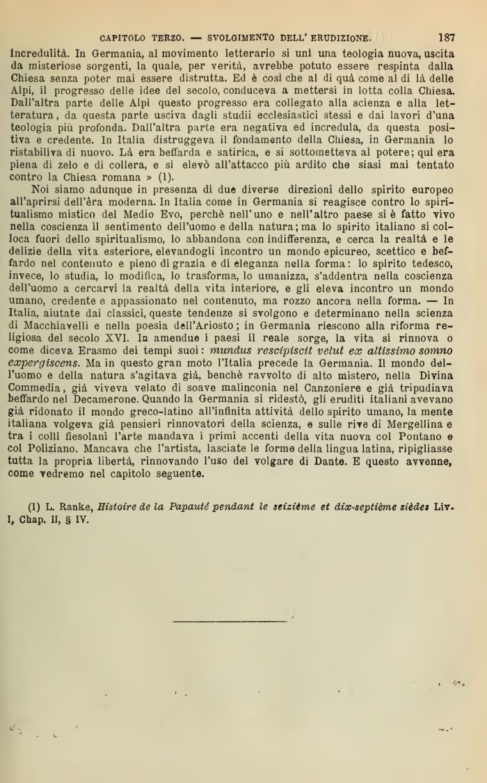 Noi siamo adunque in presenza di due diverse direzioni dello spirito europeo all'aprirsi dell'era moderna. In Italia come in Germania si reagisce contro lo spiritualismo mistico del Medio Evo, perchè nell'uno e nell'altro paese si è fatto vivo nella coscienza il sentimento dell'uomo e della natura; ma lo spirito italiano si colloca fuori dello spiritualismo, lo abbandona con indifferenza, e cerca la realtà e le delizie della vita esteriore, elevandogli incontro un mondo epicureo, scettico e beffardo nel contenuto e pieno di grazia e di eleganza nella forma: lo spirito tedesco, invece, lo studia, lo modifica, lo trasforma, lo umanizza, s'addentra nella coscienza dell'uomo a cercarvi la realtà della vita interiore, e gli eleva incontro un mondo umano, credente e appassionato nel contenuto, ma rozzo ancora nella forma. — In Italia, aiutate dai classici, queste tendenze si svolgono e determinano nella scienza di Macchiavelli e nella poesia dell'Ariosto ; in Germania riescono alla riforma religiosa del secolo XVI. In amendue i paesi il reale sorge, la vita si rinnova o come diceva Erasmo dei tempi suoi : mundus rescipiscit velut ex altissimo somno expergiscens. Ma in questo gran moto l'Italia precede la Germania. Il mondo dell'uomo e della natura s'agitava già, benché ravvolto di alto mistero, nella Divina Commedia, già viveva velato di soave malinconia nel Canzoniere e già tripudiava beffardo nel Decamerone. Quando la Germania si ridestò, gli eruditi italiani avevano già r donato il mondo greco-latino all'infinita attività dello spirito umano, la mente itamana volgeva già pensieri rinnovatori della scienza, e sulle rive di Mergellina e tra i colli fiesolani l'arte mandava i primi accenti della vita nuova col Pontano e col Poliziano. Mancava che l'artista, lasciate le forme della lingua latina, ripigliasse tutta la propria libertà, rinnovando l'uso del volgare di Dante. E questo avvenne, come vedremo nel capitolo seguente.