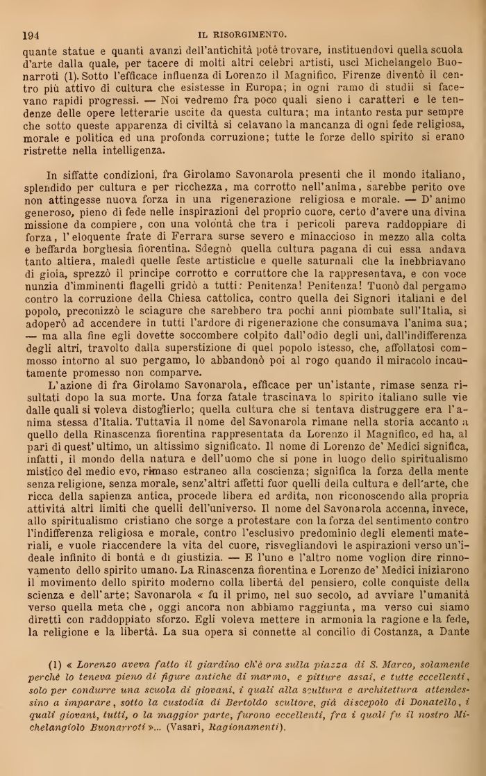 quante statue e quanti avanzi dell'antichità potè trovare, istituendovi quella scuola d'arte dalla quale, per tacere di molti altri celebri artisti, uscì Michelangelo Buonarroti (1). Sotto l'eificace influenza di Lorenzo ii Magnifico, Firenze diventò il centro più attivo di cultura che esistesse in Europa; in ogni ramo di stud si facevano rapidi progressi. — Noi vedremo fra poco quali sieno i caratteri e le tendenze delle opere letterarie uscite da questa cultura; ma intanto resta pur sempre che sotto queste apparenza di civiltà si celavano la mancanza di ogni fede religiosa, morale e politica ed una profonda corruzione; tutte le forze dello spirito si erano ristrette nella mtei'igenza.