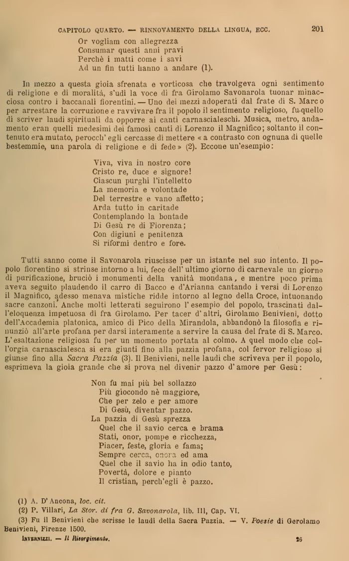(3) Fu il Benivieni che scrisse le laudi della Sacra Pazzia. — V. Poesie di Gerolamo Benivieni, Firenze 1500.
