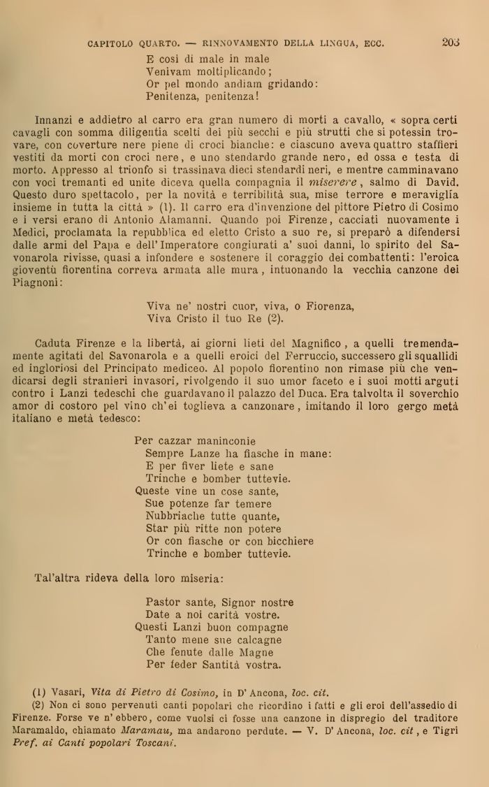 (2) Non ci sono pervenuti canti popolari che ricordino i fatti e gli eroi dell'assedio di Firenze. Forse ve n'ebbero, come vuoisi ci fosse una canzone in dispregio del traditore Maramaldo, chiamato Maramau, ma andarono perdute. — V. D' Ancona, loc. cit, e Tigri Pref. ai Canti popolari Toscani.